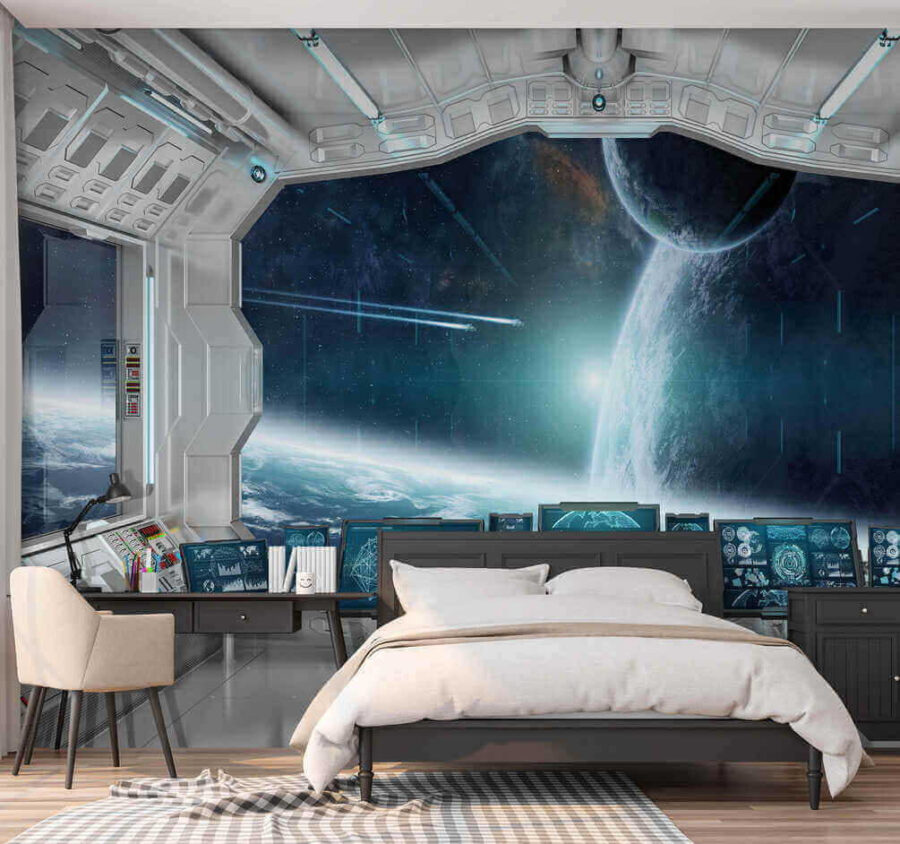 Stel je voor dat je je kamer binnenstapt en het gevoel hebt dat je het commando voert over een ruimteschip – klinkt cool, toch? Deze muurschildering doet precies dat. Het is net een portaal naar een ander universum, compleet met futuristische besturing en een adembenemend uitzicht op de ruimte! Perfect om groots te dromen en op denkbeeldige avonturen te gaan – kinderen en volwassenen met een jong hart zullen er dol op zijn. Het is niet zomaar een muurschildering; het is een ervaring. Als je dit in je ruimte installeert, verandert deze meteen in een sci-fi wonderland. Kun je je voorstellen dat je ‘s ochtends koffie drinkt met uitzicht op verre sterrenstelsels? Over een geweldig begin van de dag gesproken! 🚀✨