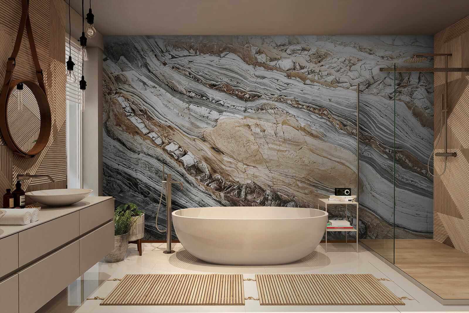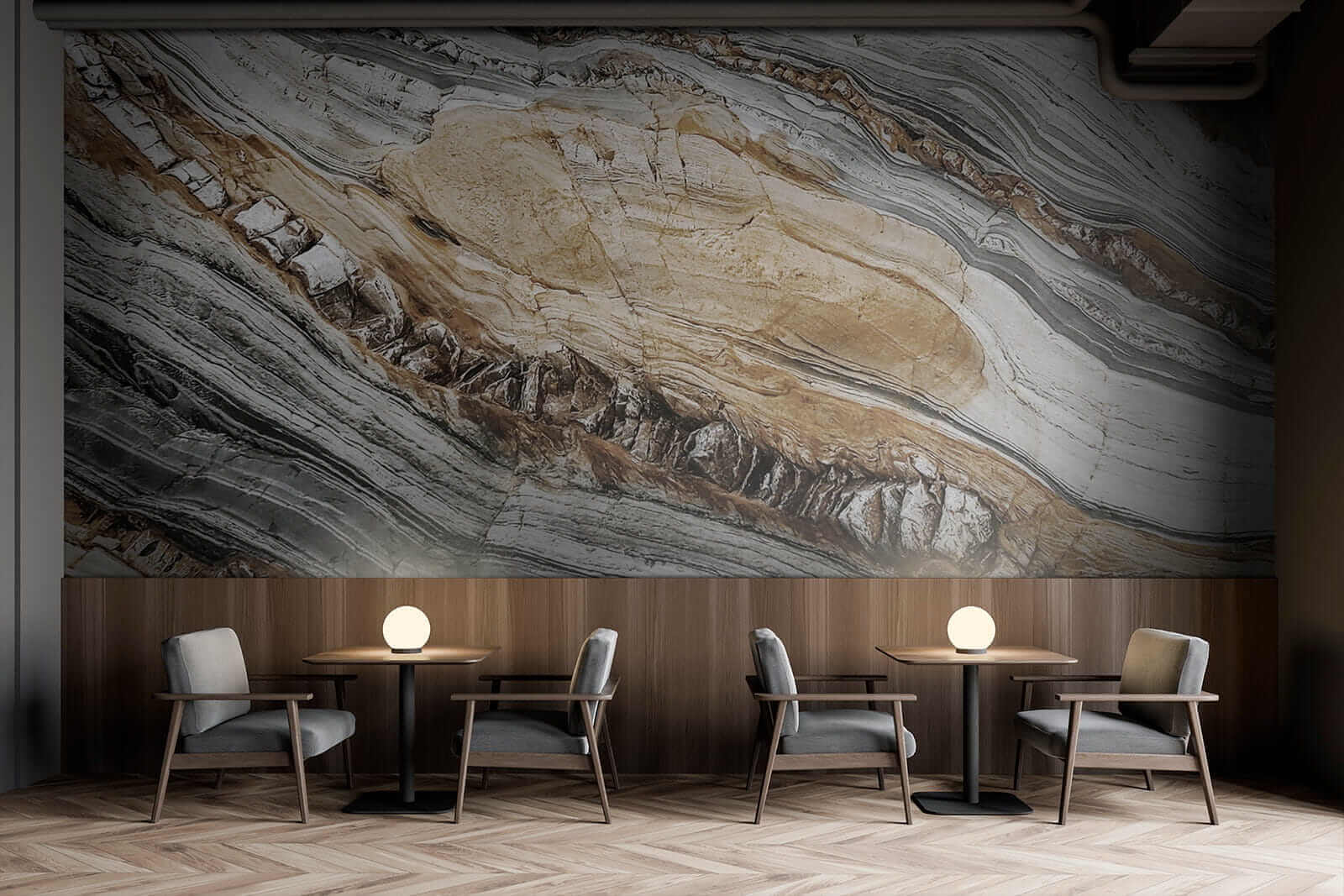 Stel je voor: je loopt je woonkamer binnen en BAM, daar is het, een betoverende weergave van natuurlijke rotslagen in rustgevende aardetinten. Deze muurschildering is als kunst uit de natuur en brengt een aardse, geaarde sfeer in je ruimte. Het heeft een ongelooflijk 3D-effect – het voelt bijna alsof je de gemarmerde texturen kunt aanraken.