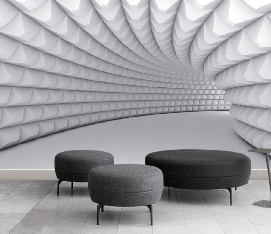 Stap in een betoverende wereld met deze futuristische geometrische tunnelmuurschildering. Stel je voor dat je een gewone muur verandert in een meeslepende reis – waar elke blik voelt alsof je in een golf van scherpe hoeken en vloeiende rondingen duikt. Het is alsof je verdwaalt in een droom waar alles vorm en doel heeft. Dit ontwerp, dat perfect is voor een lounge of creatieve ruimte, stimuleert gesprekken en inspireert. Stel je voor dat vrienden het bewonderen onder het genot van een kopje koffie, of gewoon dagdromen over andere werelden. Het voegt moeiteloos diepte en een speelse sfeer toe en nodigt iedereen uit om een kijkje te nemen, en misschien wel een selfie of twee!