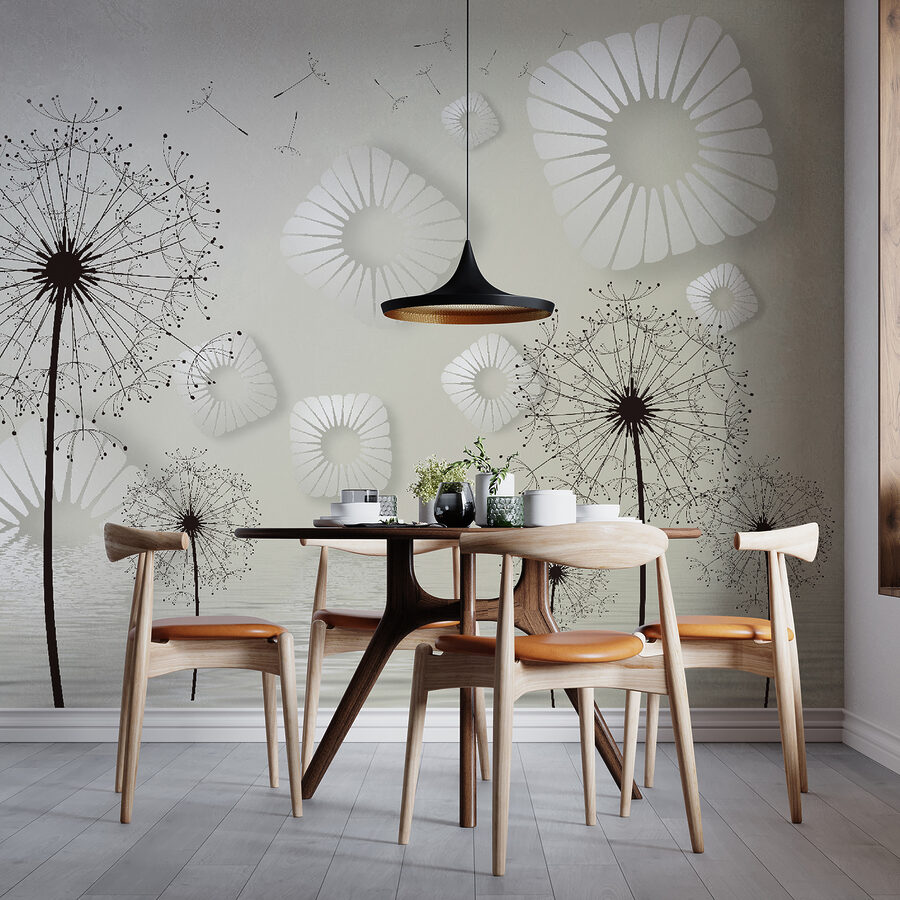 Het transformeren van een ruimte kan aanvoelen als magie en deze muurschildering geeft die sfeer perfect weer. Stel je eens voor dat je een kamer binnenstapt die beschilderd is met delicate paardenbloemen. Hun betoverende, piekerige vormen nodigen uit tot dagdromen en eigenzinnigheid. De witte cirkelvormige ontwerpen zweven als wolken en voegen een lichte, luchtige toets toe die fris en uitnodigend aanvoelt.