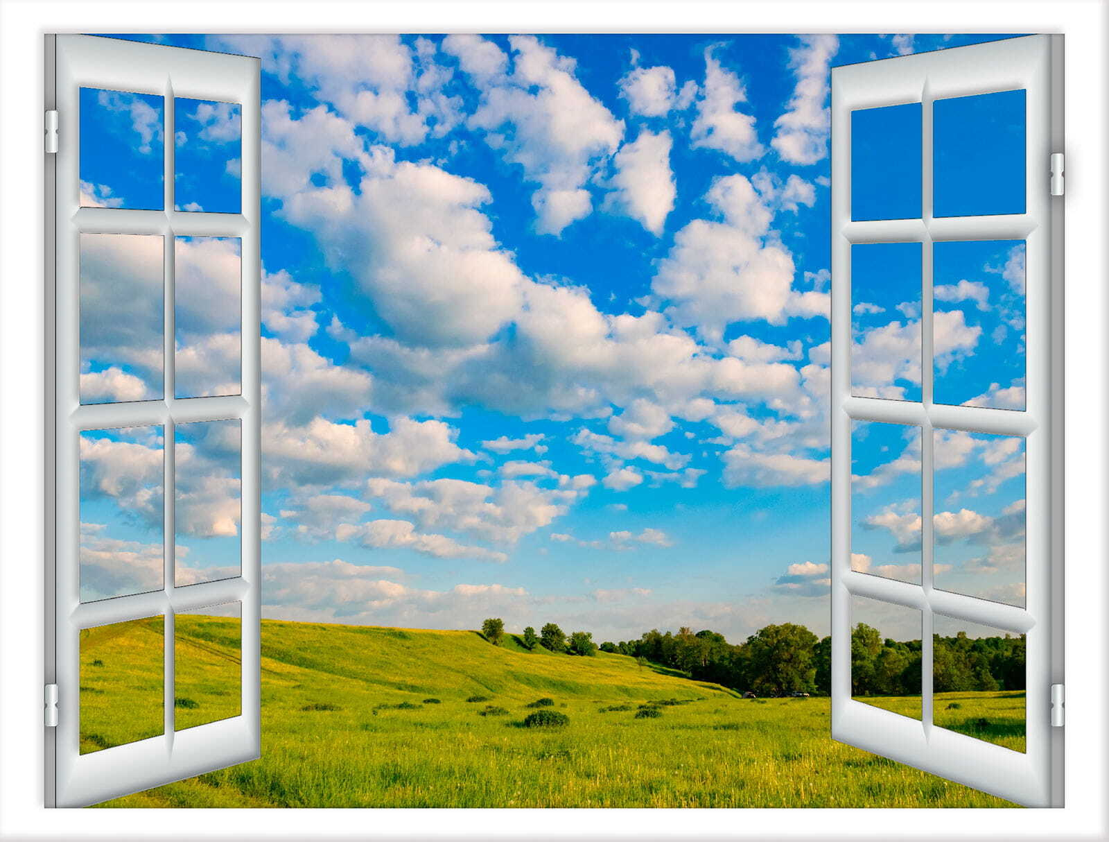 Stel je dit eens voor: een gezellig hoekje, misschien een leeshoekje of dat plekje waar je ‘s ochtends echt graag koffie drinkt. Stel je nu eens voor dat je uitkijkt op een prachtige blauwe lucht, bezaaid met pluizige wolken, en dat alles zonder je huis te verlaten. Deze muurschildering, in de vorm van een raam naar een sereen landschap, brengt die perfecte droom tot leven. Het is net een mini-vakantie elke dag! De levendige kleuren en het open gevoel fleuren elke kamer moeiteloos op. Stel je voor dat vrienden langskomen en meteen worden aangetrokken door dit vrolijke uitzicht. Eén blik en ze worden meegevoerd naar die zonovergoten weide. Wie wist dat een muur zo’n reislust kon opwekken?