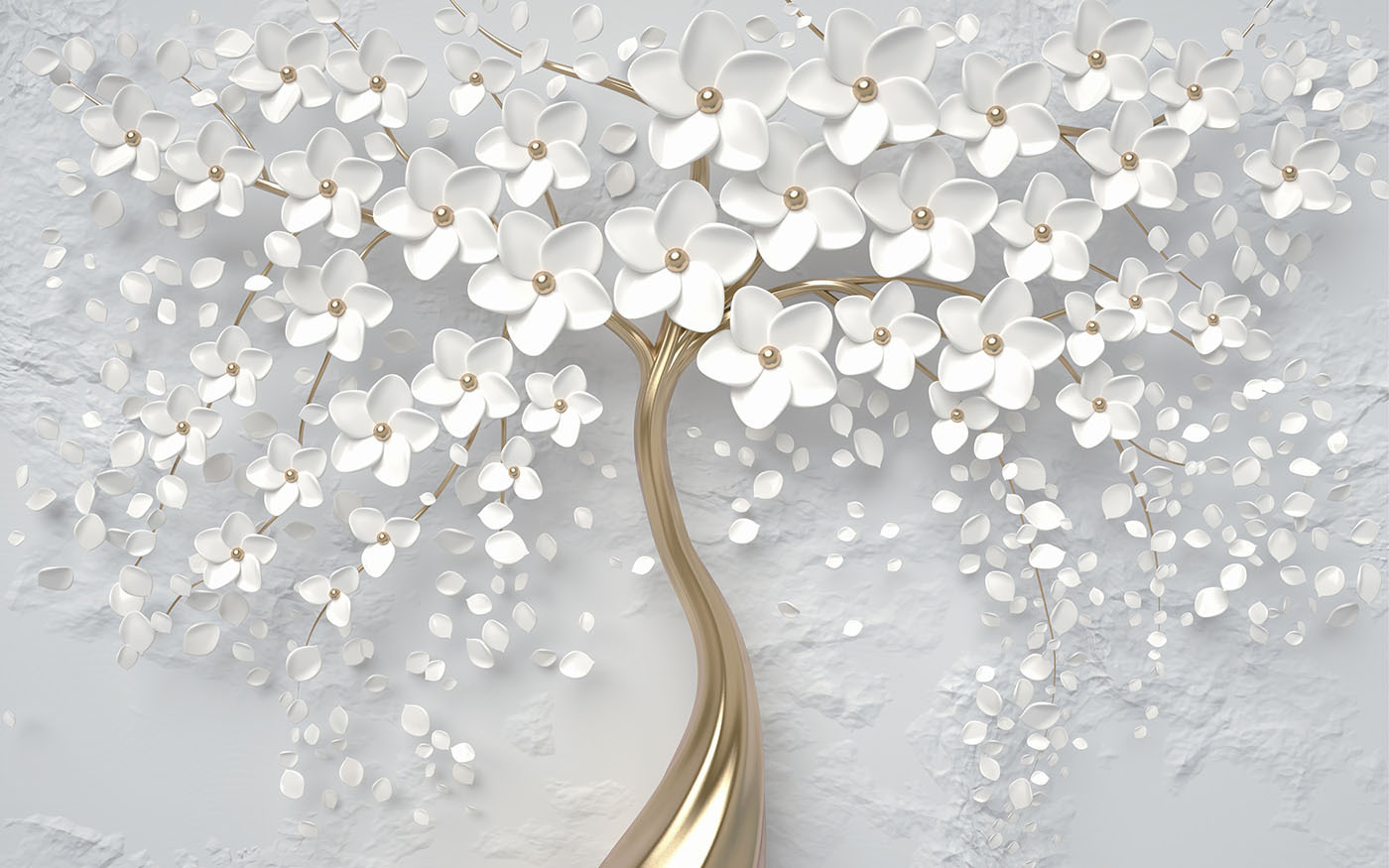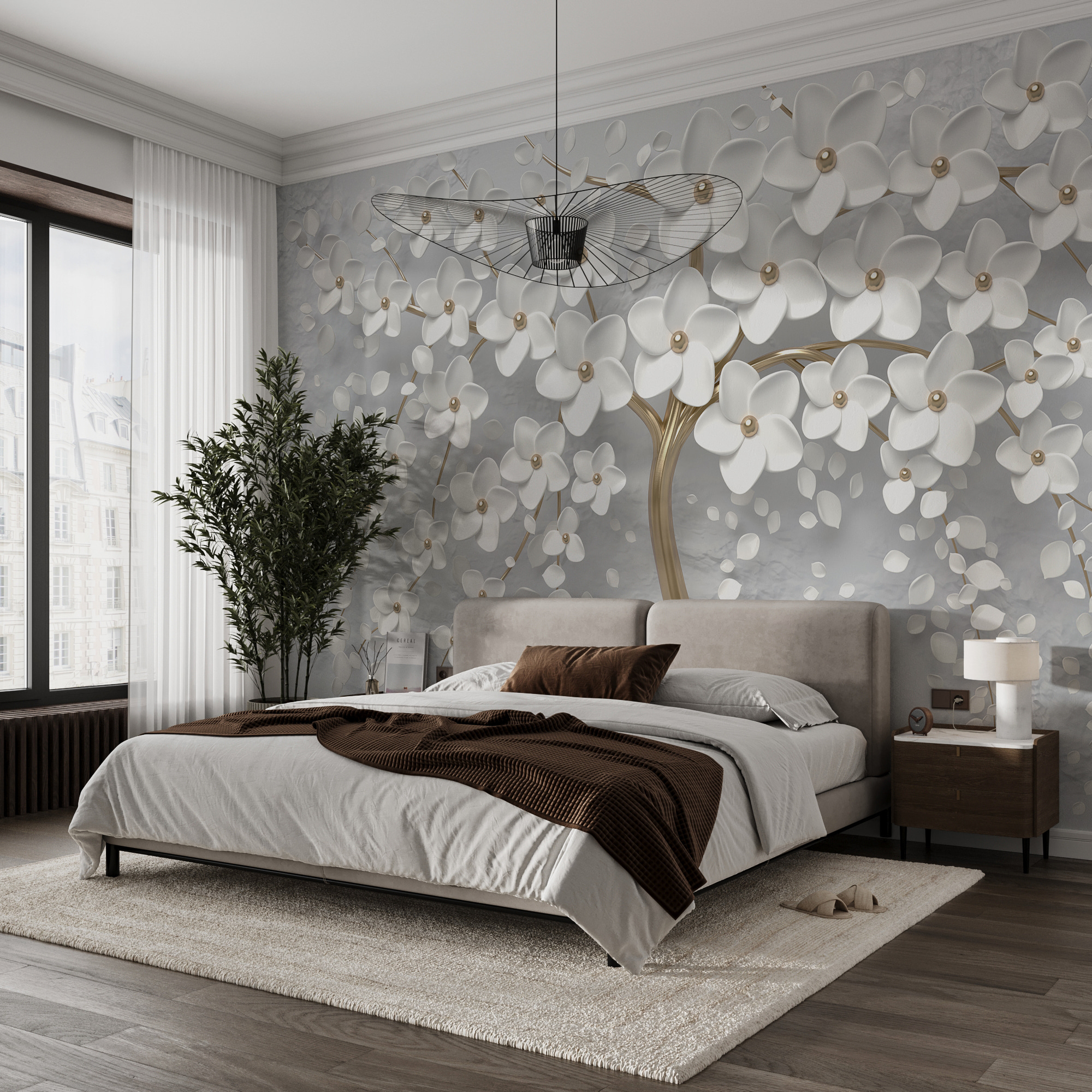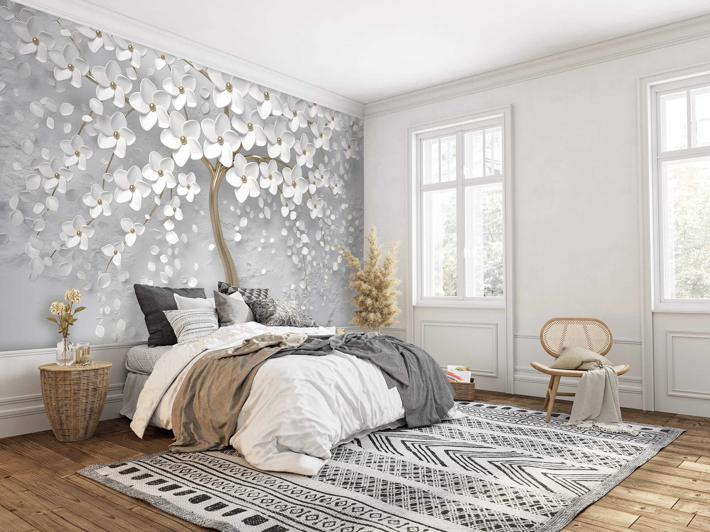 Dus als je een statement wilt maken of gewoon een rustig toevluchtsoord thuis wilt creëren, dan is deze muurschildering een topper. Het is alsof je een eeuwigdurend stukje kunst van de natuur aan je muur hebt hangen. Haal buiten naar binnen en geniet elke dag van de rustgevende aanwezigheid van die prachtige witte bloesems!
