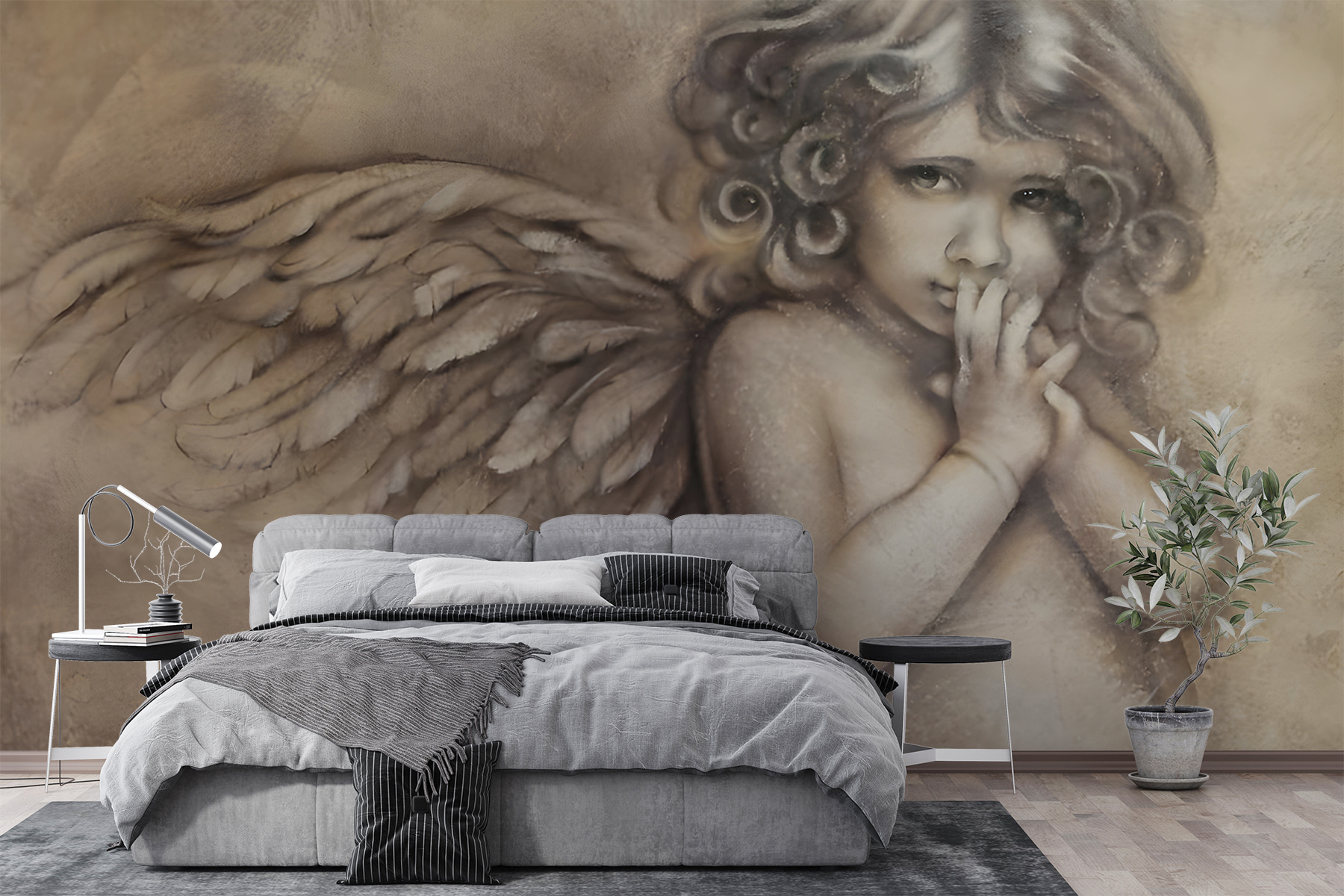 Altijd al een vleugje eigenzinnigheid op je muren willen hebben? Maak kennis met de muurschildering “Peinzende engel met zachte vleugels”. Het is als de zachte zucht van een winderige middag, gevangen in kunst. Deze engel, die diepe gedachten denkt met die prachtige delicate vleugels, zal warmte en harmonie uitnodigen in elke kamer.