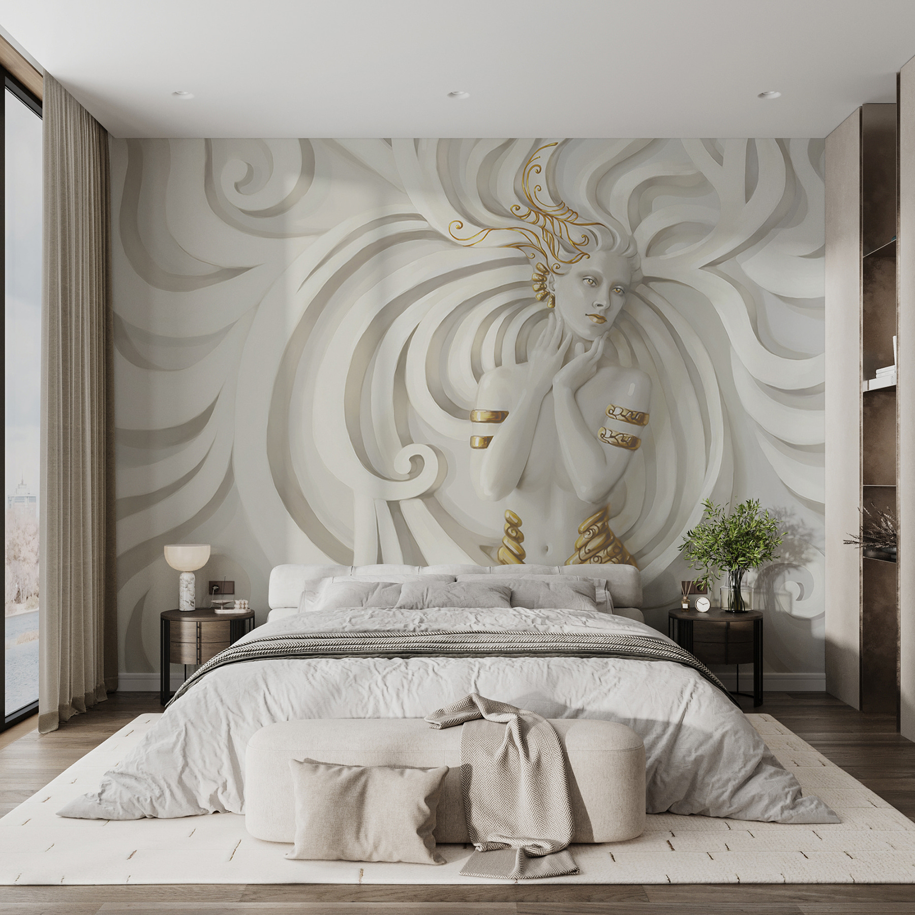 Transformeer elke ruimte met deze prachtige muurschildering met een elegante figuur gehuld in wervelende patronen. Het is alsof je een droom binnenstapt waar kunst en sereniteit elkaar ontmoeten. Stel je eens voor dat je vrienden ontvangt en hun mond open valt als ze dit werk zien. De manier waarop de rondingen rond de figuur dansen, trekt je gewoon naar binnen en nodigt uit tot een moment van rust. Perfect voor een gezellige leeshoek of een opvallende muur in je woonkamer, het voegt een unieke charme en een vleugje eigenzinnigheid toe aan elke ruimte. Wie wist dat kunst zo’n uitstraling kon hebben?
