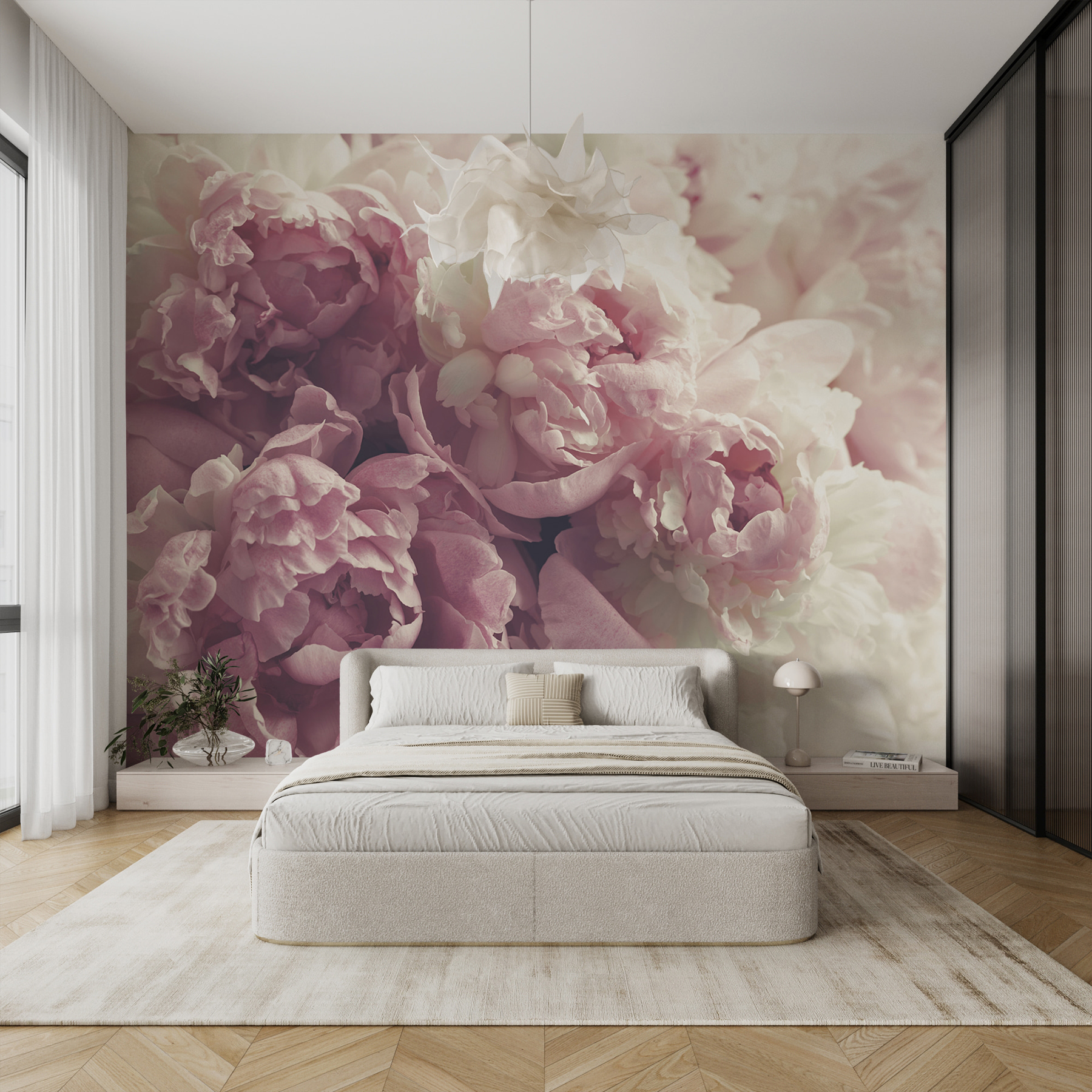 Tover elke kamer om in een dromerige tuin met deze muurschildering met een mooie bos roze en witte bloemen. Stel je voor dat je elke dag wakker wordt met deze zachte bloemen, die een serene achtergrond vormen voor je ochtendkoffierituelen of je gesprekken op de late avond. Het is alsof je een stukje natuur binnenshuis hebt zonder de pollen – hier hoef je niet te niezen! Elke bloem lijkt een kalme uitnodiging te fluisteren om te ontspannen en te genieten van de eenvoudige genoegens van het leven. Deze muurschildering is perfect om een woonkamer of een gezellig hoekje op te fleuren en brengt warmte en charme, als een knuffel van een oude vriend. Denk je eens in, het kan zelfs de saaiste muur veranderen in een vrolijke gespreksstarter.