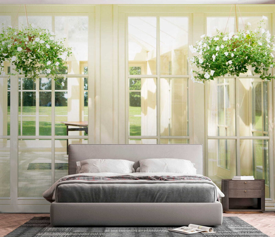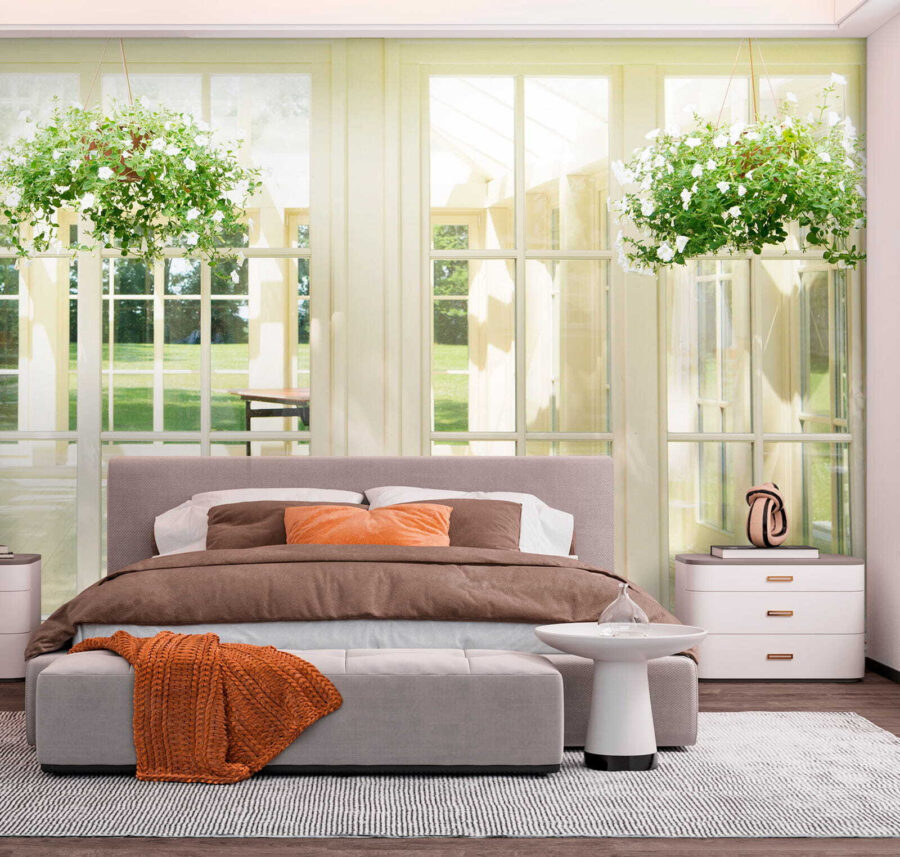 Verander een saaie muur in een serene ontsnapping met deze muurschildering “Zonovergoten kamer met hangende planten”. Stel je voor dat je wakker wordt in een lichte, luchtige ruimte die het hele jaar door zomers aanvoelt. Die weelderige hangplanten geven iedereen het gevoel dat ze een rustige tuin zijn binnengestapt, zelfs al is het maar je woonkamer.