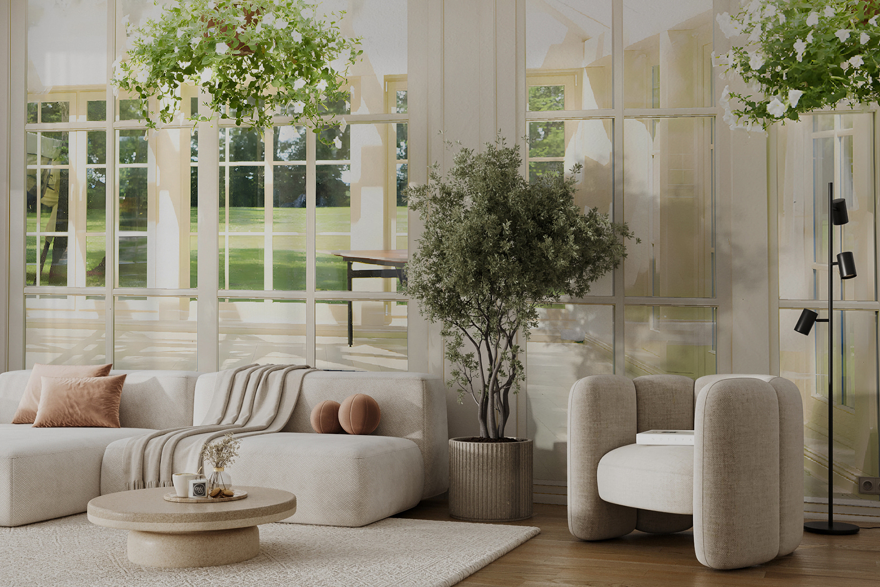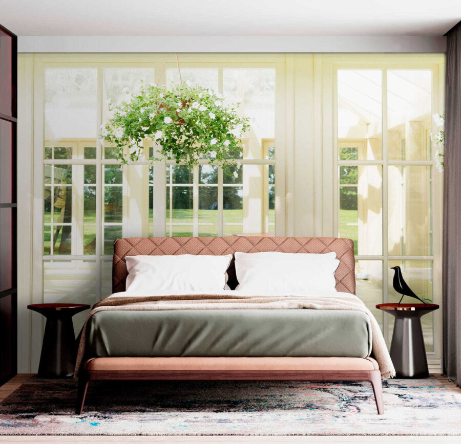 Het zachte licht dat door de ramen naar binnen schijnt, creëert een gezellige sfeer, ideaal voor luie zondagochtenden met koffie in de hand. Bovendien zorgt het groen voor een vleugje frisheid, waardoor het voelt alsof de natuur binnen handbereik is. Deze muurschildering is perfect voor elke kamer die hunkert naar een vleugje warmte en charme. Wie wil zich niet een beetje meer verbonden voelen met het buitenleven, toch?