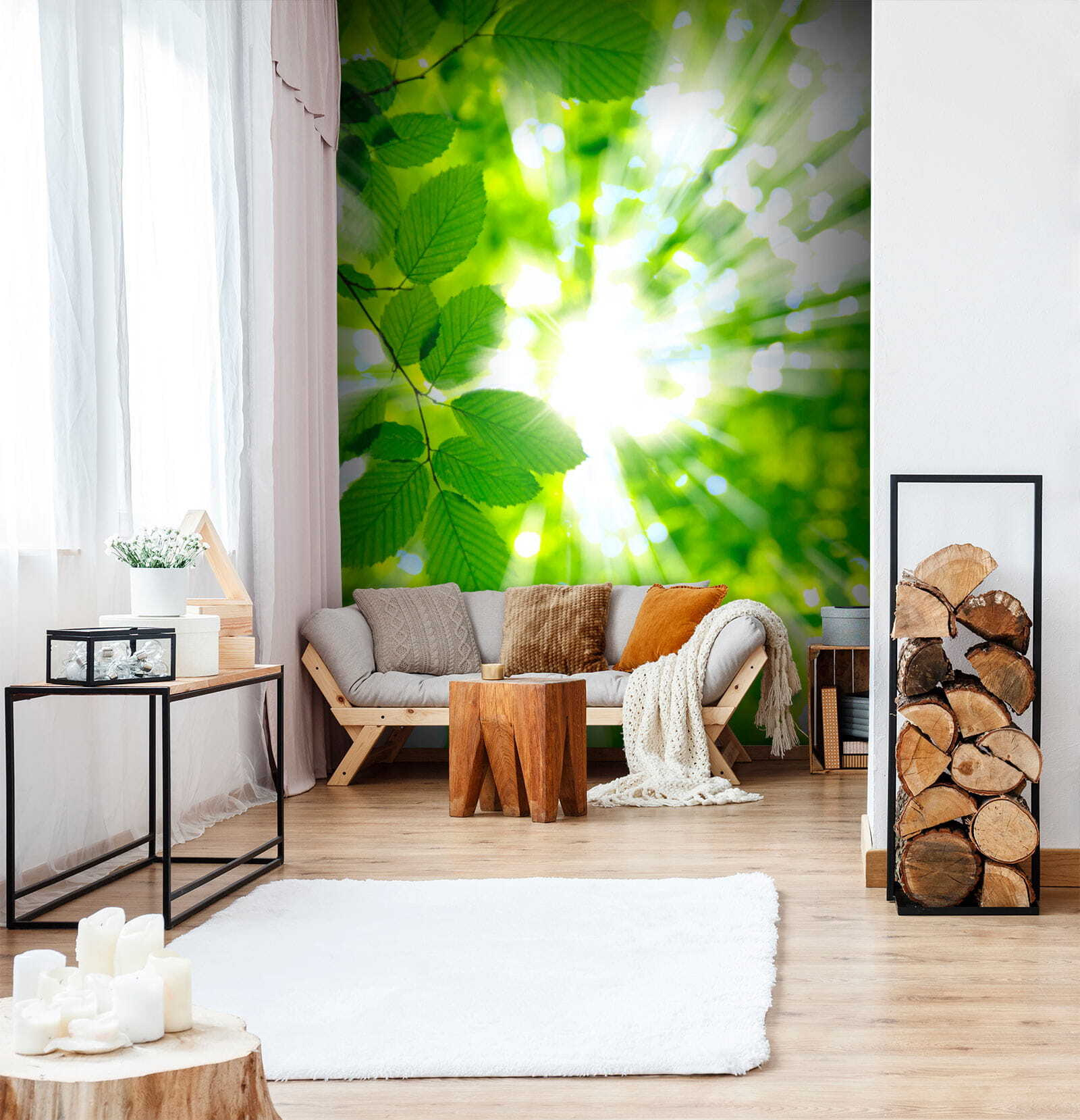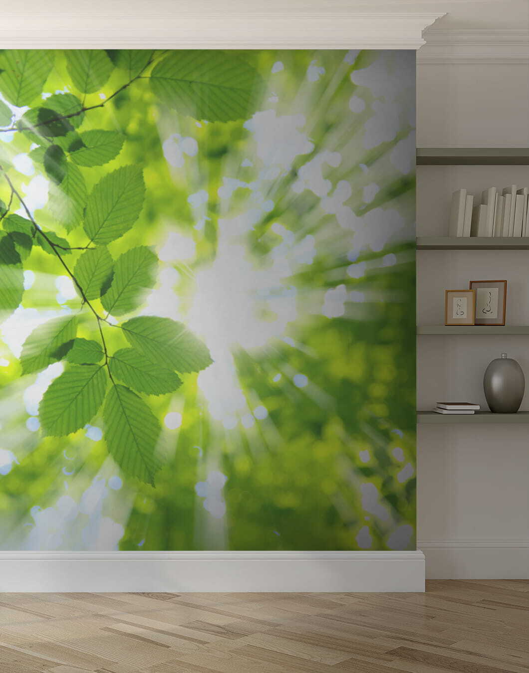 De manier waarop het licht door die bladeren filtert – het is pure magie, bijna alsof je de warmte op je gezicht kunt voelen. Het is onovertroffen sereen, alsof de natuur je een knuffel geeft telkens als je de kamer binnenloopt. Ideaal voor een slaapkamer, thuiskantoor of dat leeshoekje dat je steeds belooft om meer te gebruiken. Deze muurschildering is niet zomaar decor; het is een stukje rust aan je muur. Laten we het er allemaal over eens zijn: wie heeft daar geen behoefte aan?