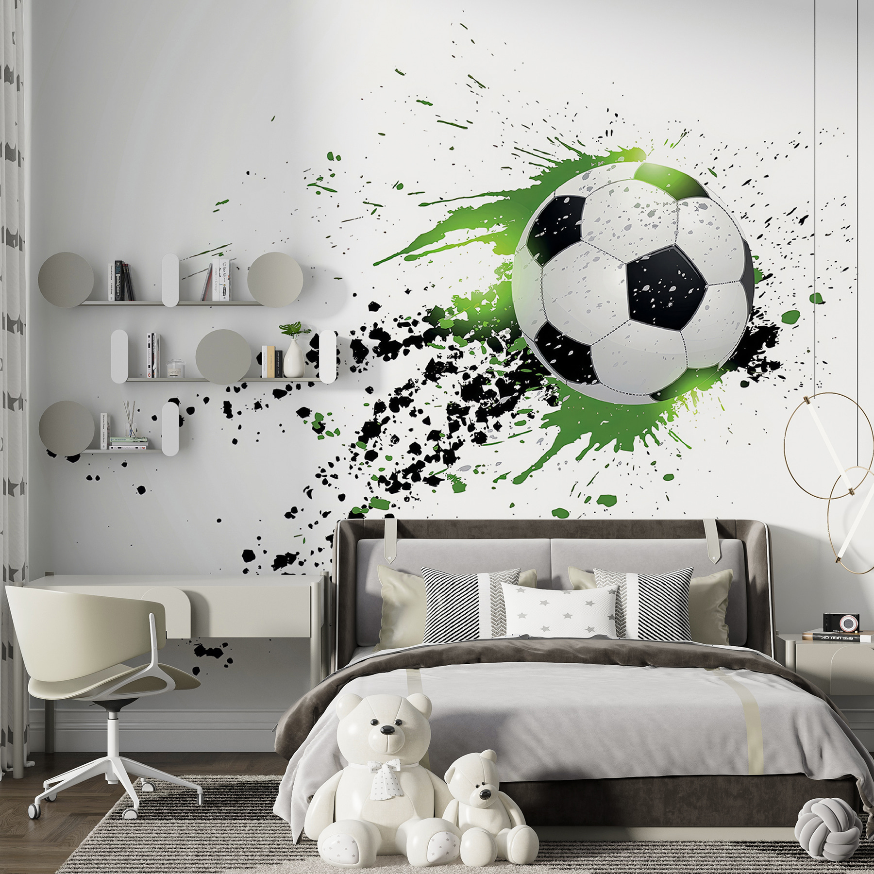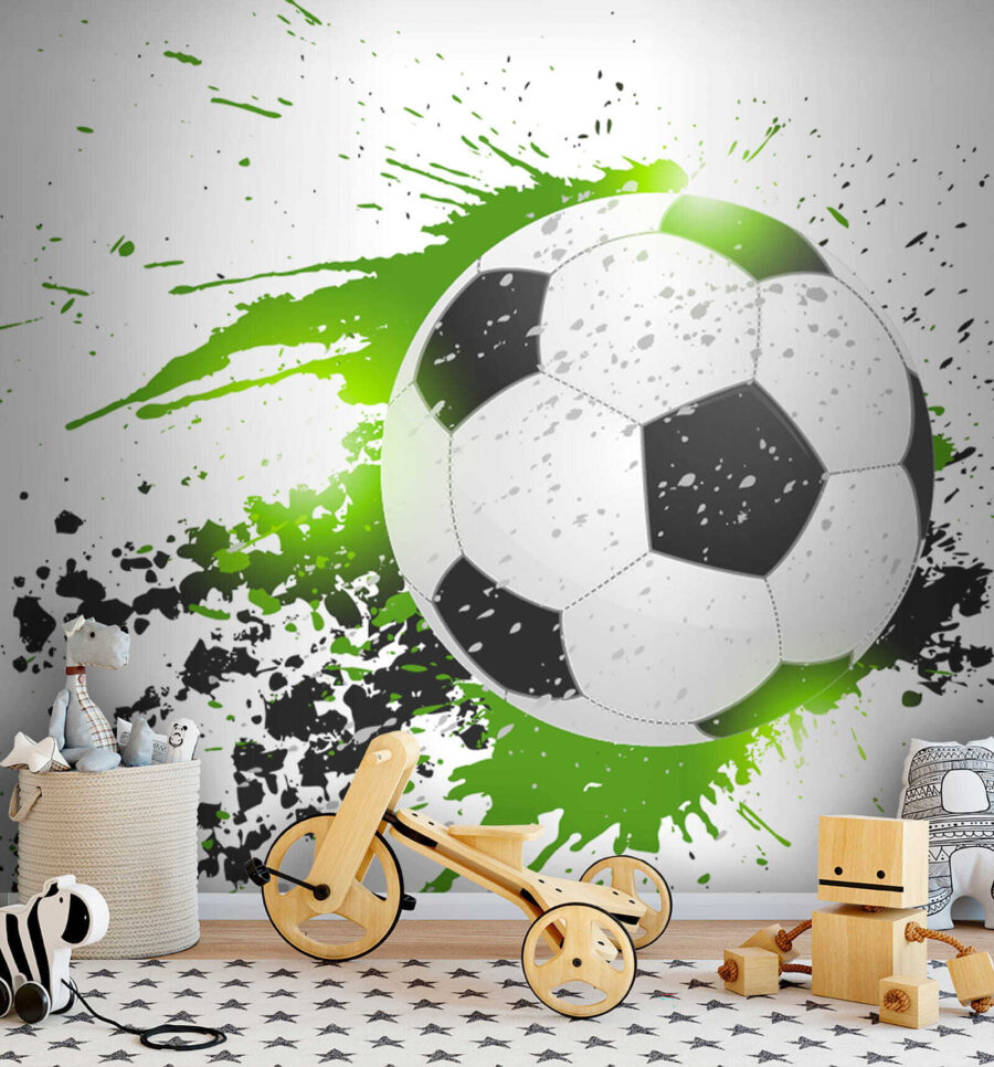 Hallo daar! Stel je dit eens voor – een spetter van kleuren en een vliegende voetbal op je muur. Dat is wat je krijgt met de “Voetbal met artistieke spetters” muurschildering. Het is alsof iemand het perfecte, actievolle moment van een wedstrijd heeft vastgelegd, het in de tijd heeft bevroren en er vervolgens een beetje artistieke flair aan heeft toegevoegd. De groene en zwarte spetters geven het zo’n levendige, leuke uitstraling. De kamer van je kiddo zou meteen veranderen in een cool, sportief toevluchtsoord. En eerlijk is eerlijk, zelfs je vrienden zouden er jaloers op kunnen zijn! Je kunt het gejuich bijna horen en de opwinding voelen elke keer als je er naar kijkt. Helemaal geweldig voor jonge voetbalfanaten die groots dromen, toch?
