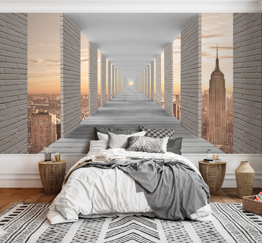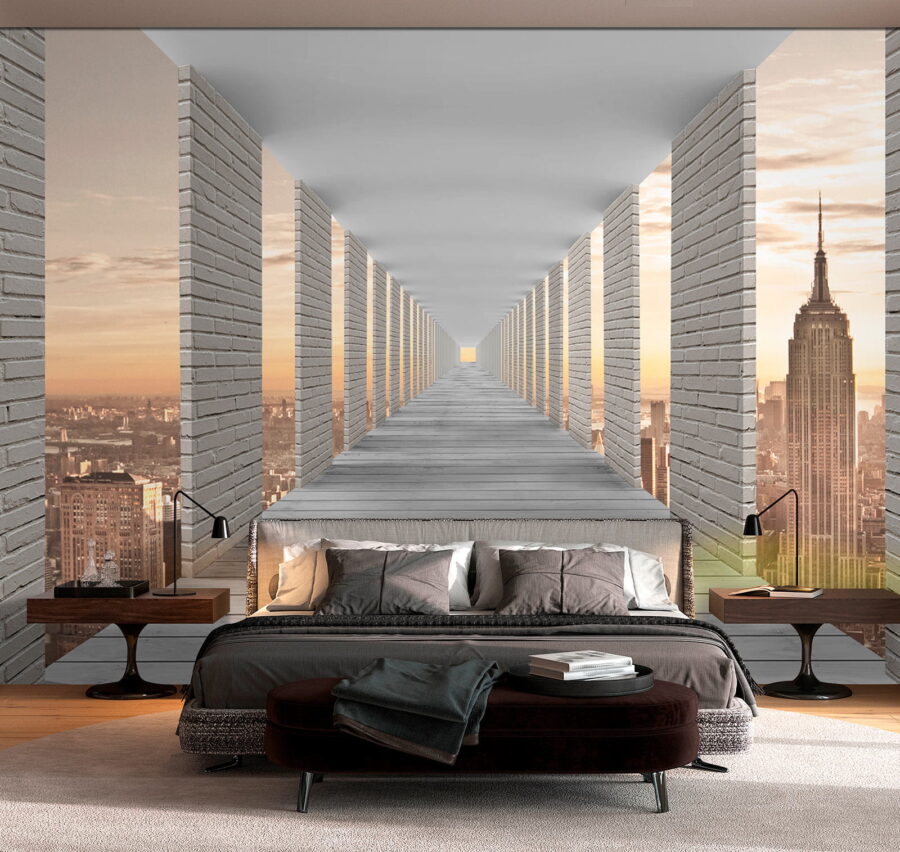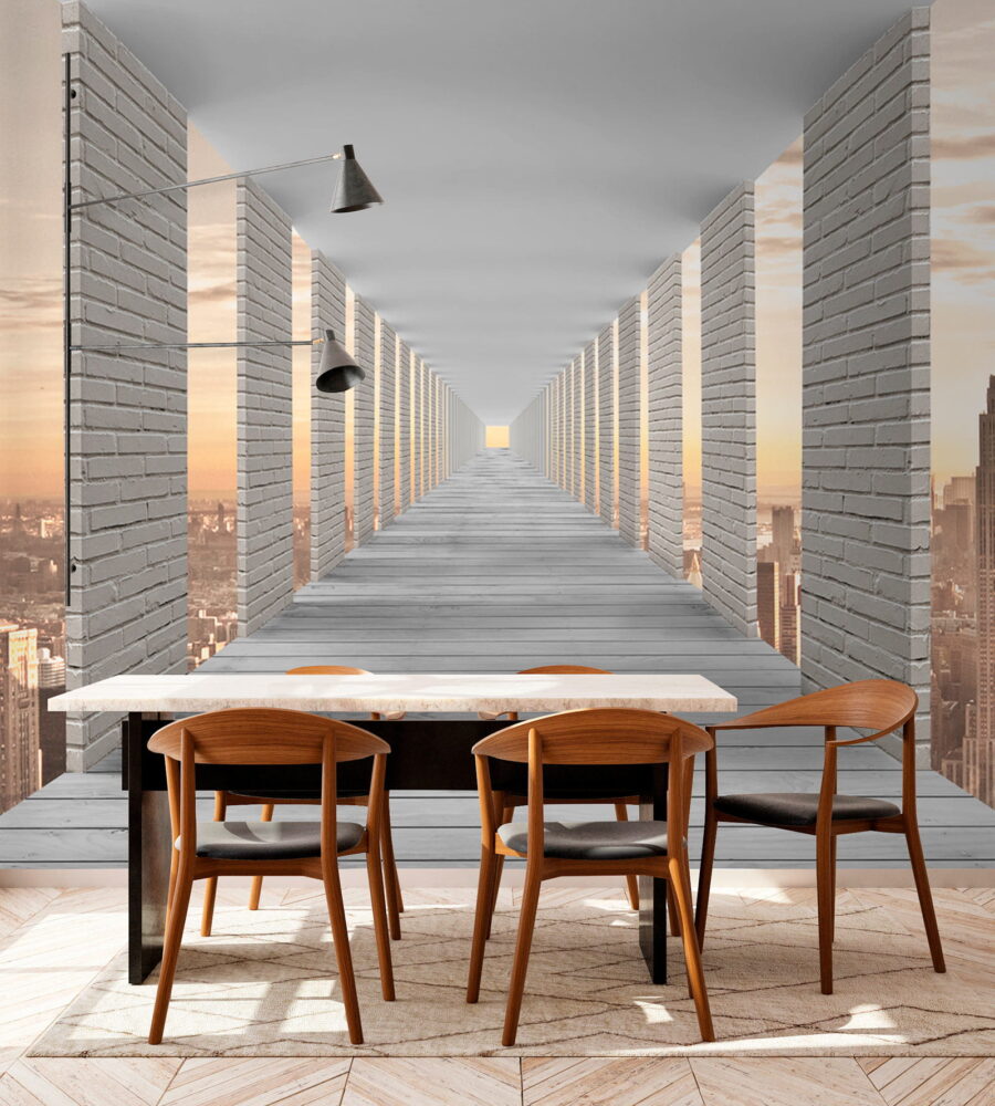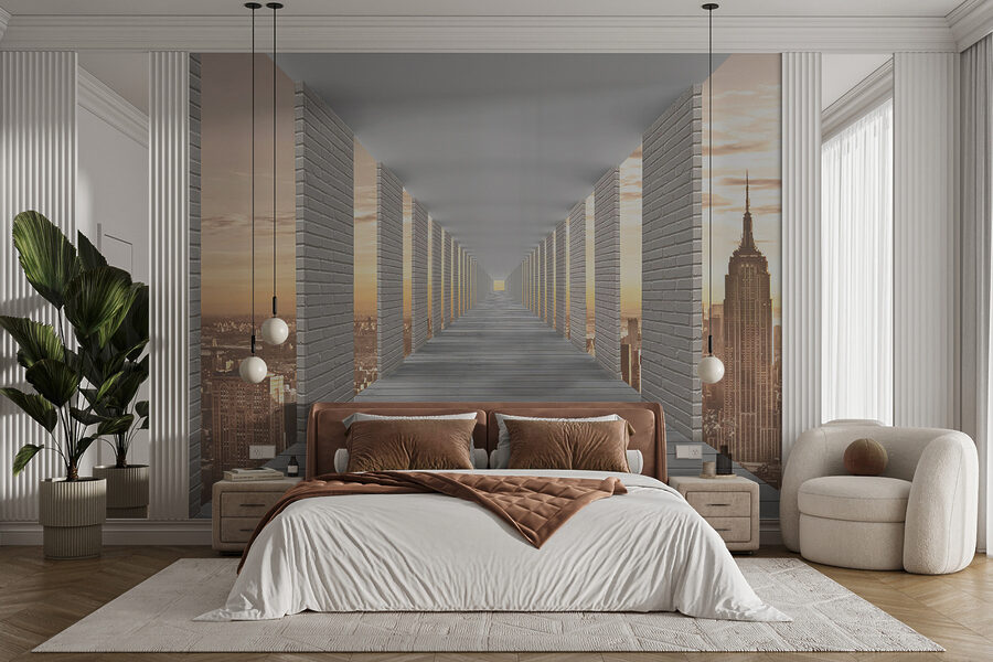 Stel je voor dat je deze dromerige muurschildering op je muur hebt, waar een eindeloze gang leidt naar een magisch stadslandschap. De koele, scherpe lijnen van het hoge gebouw en die eindeloze ramen geven je ruimte een gevoel van diepte – bijna alsof je kamer volwassen is geworden en een heel nieuw niveau van verfijning heeft bereikt. De warme tinten van de zonsondergang buiten de “ramen” zorgen voor een knusse en toch uitgestrekte sfeer, perfect om te dagdromen of om te doen alsof je in een chique stedelijke loft bent. Het is alsof je muren ontdekten dat ze konden ontsnappen zonder jou achter te laten! Het verandert een saaie muur in een gespreksonderwerp. De sfeer van deze muurschildering is gewoon zo… stads-chique, weet je? En wie wil dat nou niet in zijn woonkamer of kantoor?