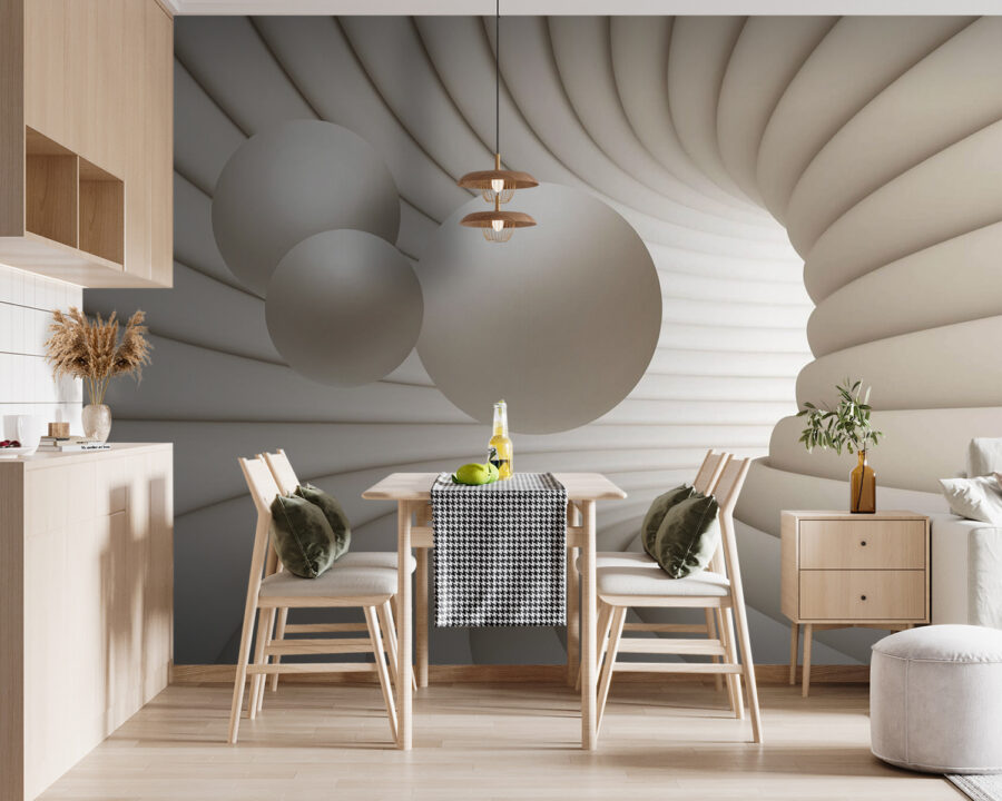 Verander elke kamer in een grillige ontsnapping met deze boeiende muurschildering met wervelende bollen in een abstracte ruimte. Stel je eens voor dat je in een dromerige dimensie stapt waar rondingen vloeien en glanzende bollen speels langs de muren dansen. Het is alsof je een beetje van de kosmos uitnodigt in je woonruimte. Kijk er een tijdje naar en misschien voel je je zorgen wel wegzweven. Deze muurschildering, die perfect is voor een gezellige leeshoek of een levendige woonkamer, nodigt uit tot creativiteit en gesprekken en vormt zo een intrigerende achtergrond voor de momenten in je leven. Waarom zou je niet de sprong wagen en je muren een beetje magie laten fluisteren?