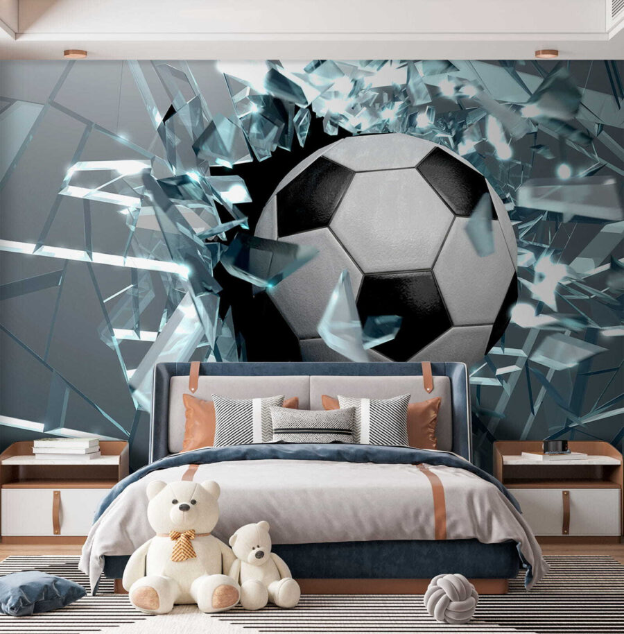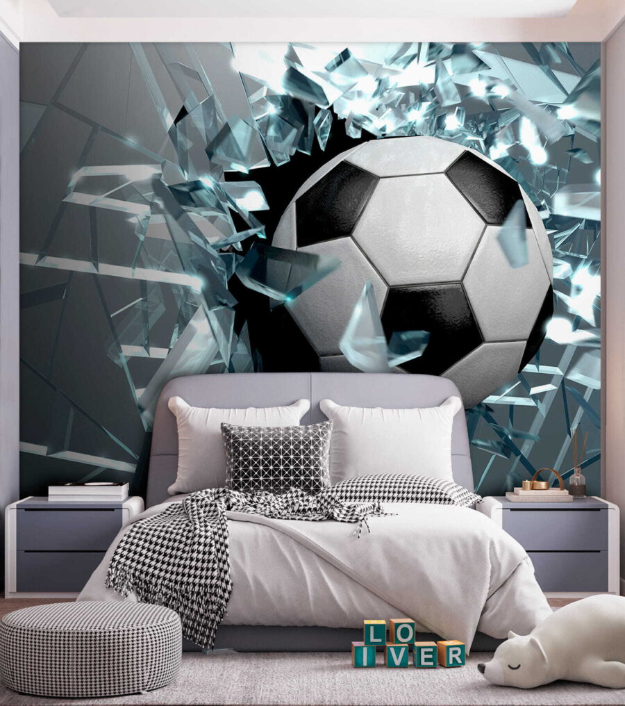 Deze muurschildering verandert een kamer in een bruisend avontuur en brengt de spannende energie van voetbal rechtstreeks naar je muur. Stel je een sterke voetbal voor die door een denkbeeldige barrière barst, met glasscherven die voor een levendige sfeer zorgen. Het is alsof je ruimte net het ultieme doelpunt heeft gescoord, waardoor het perfect is voor kinderen die ervan dromen om supersterren op het veld te worden. Stel je voor: er komen vriendjes langs, de ogen verwijden zich en de vragen vliegen je om de oren. Welk kind zou zich geen kampioen voelen met dit dynamische tafereel? Het is meer dan alleen decoratie; het is inspiratie, opwinding en een heleboel plezier!