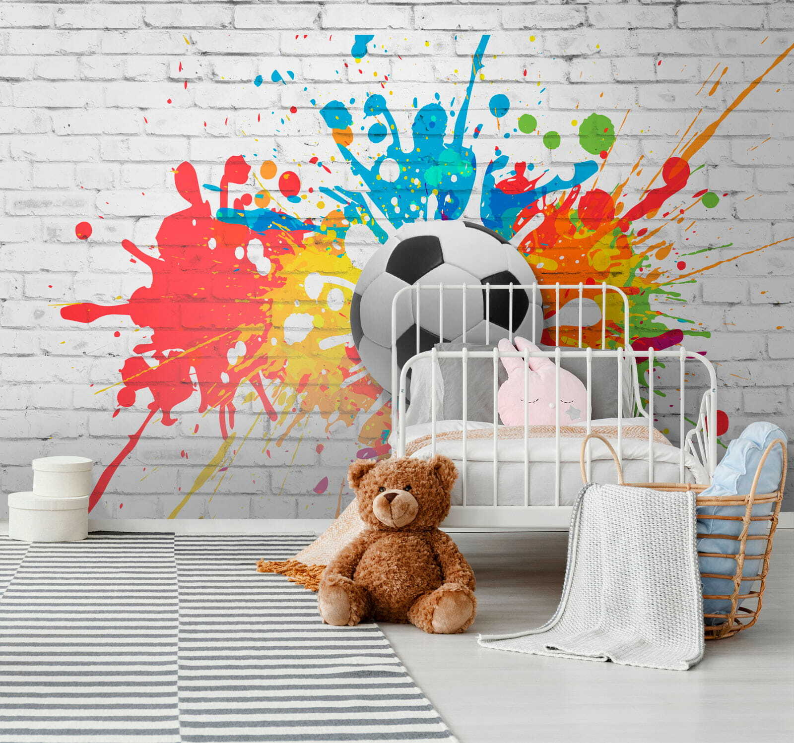Stel je dit eens voor – een levendige kleurenpracht tegen een witte bakstenen muur en precies in het midden een klassieke zwart-witte voetbal. Het is alsof iemand het spannendste doelpunt ter wereld heeft genomen en het in je woonkamer heeft ingevroren. Deze muurschildering is perfect voor een kinderkamer en heeft alle energie van een stadion op één muur. De felle tinten steken af tegen de monochrome bal en creëren een contrast dat zowel speels als opvallend is. Het is 3D-magie die het spel tot leven brengt! Stel je de opwinding op het gezicht van je kind voor als ze binnenkomen en dit zien – een dagelijkse achtergrond voor hun dromen om het winnende doelpunt te scoren. Of ze nu spelen of gewoon rondhangen, deze muurschildering zorgt voor de perfecte sfeer.