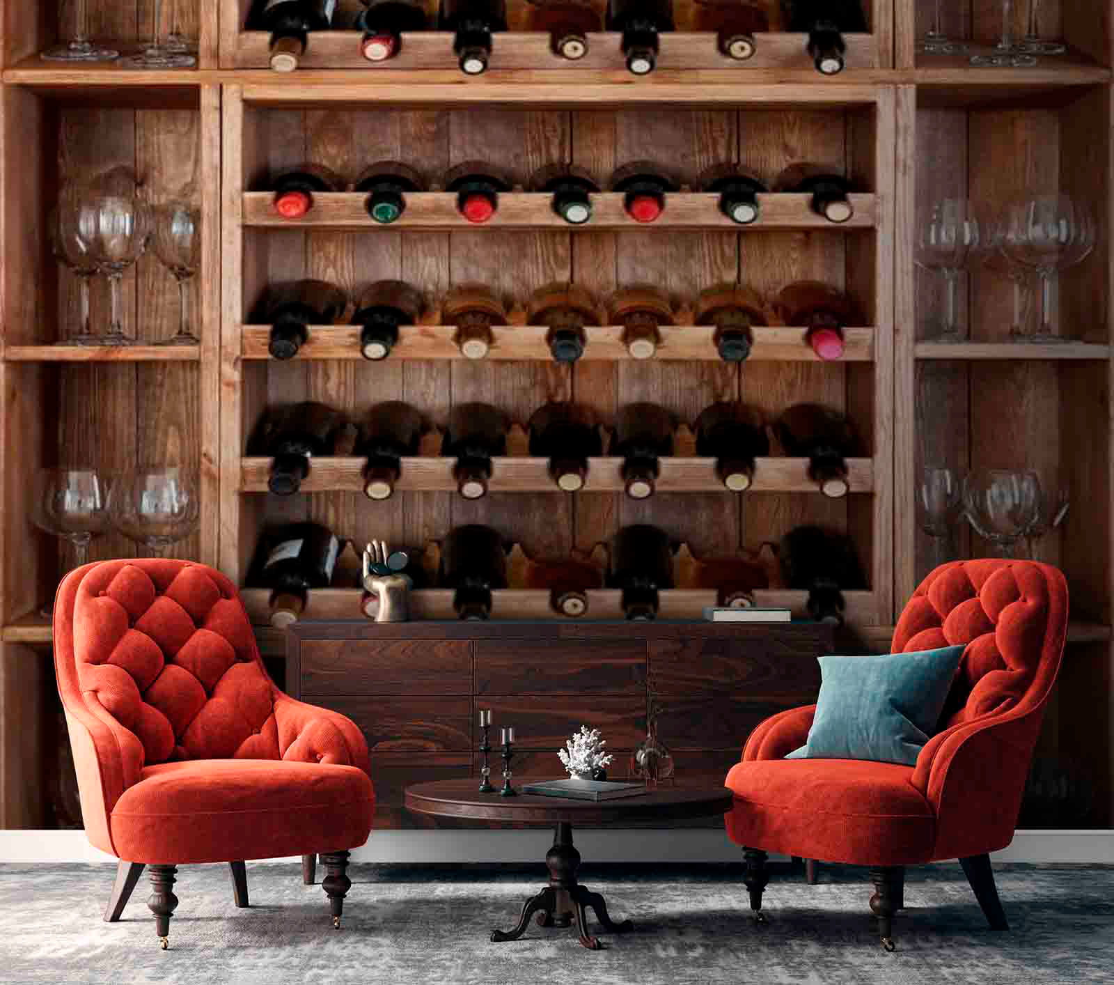 Fotobehang Wijnflessen en glazen op planken. (SKU: u65213)