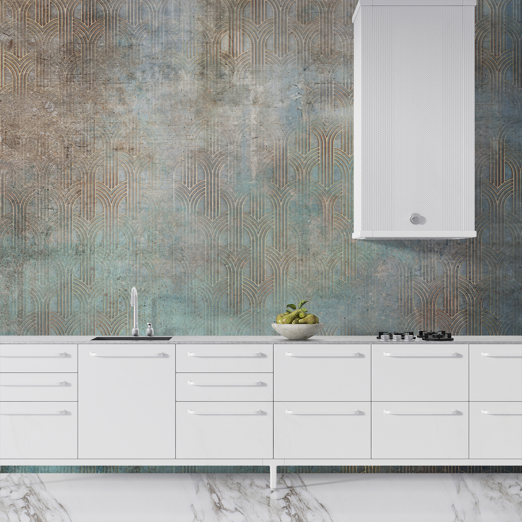 Verander elke kamer in een levendig toevluchtsoord met deze muurschildering met een prachtig abstract groenblauw en koperkleurig geometrisch patroon. Het is alsof je een stuk moderne kunst rechtstreeks naar je muren brengt, waardoor het de perfecte achtergrond wordt voor gezellige bijeenkomsten of rustige momenten loungen met een boek. Stel je een zonnige ochtend voor, het licht schijnt door en werpt speelse schaduwen die over de geometrische vormen dansen. Het is zeker een gespreksonderwerp, met zijn stijlvolle ontwerp dat verhalen van creativiteit en elegantie oproept. Bovendien is het een eenvoudige upgrade die de hele kamer een frisse en uitnodigende uitstraling geeft. Perfect voor degenen die hunkeren naar een vleugje persoonlijkheid in hun inrichting!