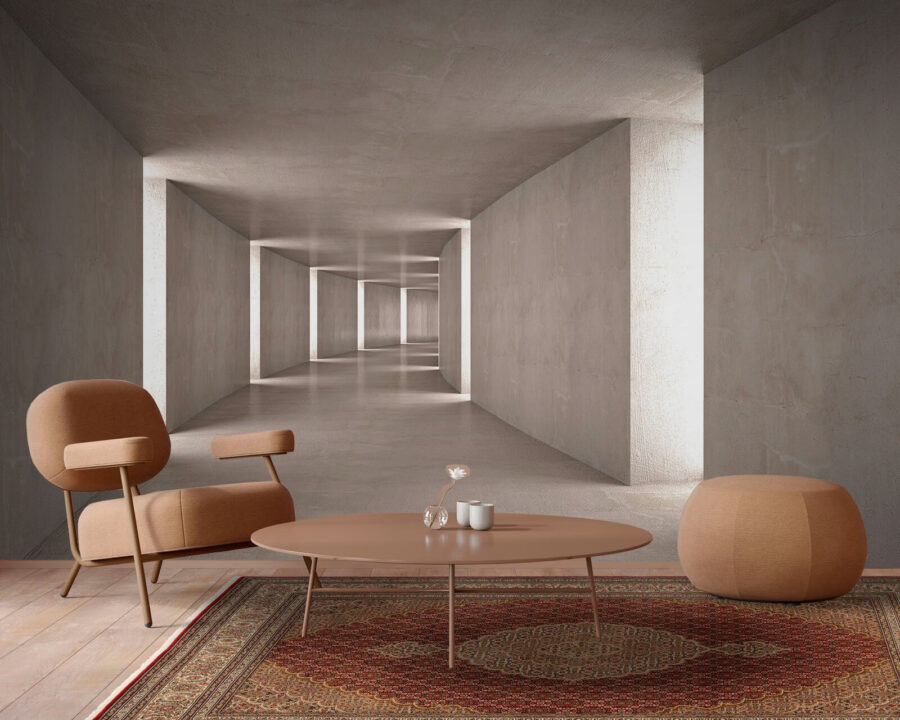 Deze muurschildering met 3D-effect is perfect voor iedereen met een voorliefde voor strakke, eigentijdse sferen. Gasten zullen gegarandeerd versteld staan. Het is alsof je een architectonisch kunstwerk in je woonkamer of kantoor hebt, dat diepte en een vleugje mysterie toevoegt. En die gladde betonlook? Pure, ingetogen elegantie.