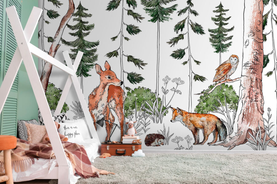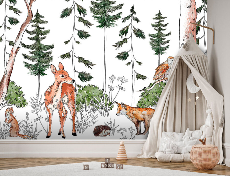 Transformeer elke ruimte met deze charmante muurschildering met een vrolijke cast van bosdieren! Stel je een rustig boslandschap voor, waar een nieuwsgierig hert en een speelse vos ronddwalen tussen het weelderige groen. Een uil kijkt toe vanuit de lucht en voegt een vleugje fantasie toe. Het is alsof je een stukje natuur aan je muur hebt hangen. Deze muurschildering is perfect voor een gezellig leeshoekje of een kinderkamer en haalt de buitenlucht naar binnen, waardoor elke blik een klein avontuur wordt. Verspreid vreugde en warmte en laat verhalen zich ontvouwen in je eigen betoverende bos – met deze harige vrienden is er nooit een saai moment!