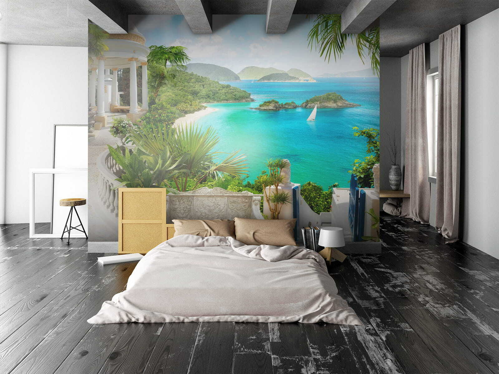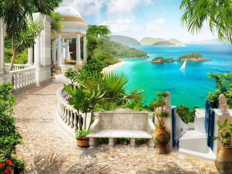 Stel je voor: je loopt je kamer binnen en je wordt meteen meegevoerd naar een sereen paradijs aan zee. Dat is precies wat de “Fotobehang Plant in a Pot” doet. Het is alsof je een minivakantieplekje aan je muur hebt. Die weelderige groene planten, het vredige witte paviljoen en dat adembenemende turquoise water – het is de perfecte sereniteit!