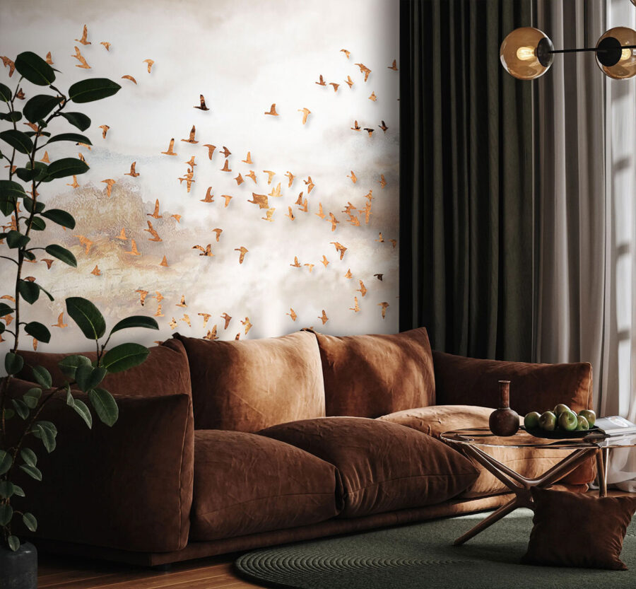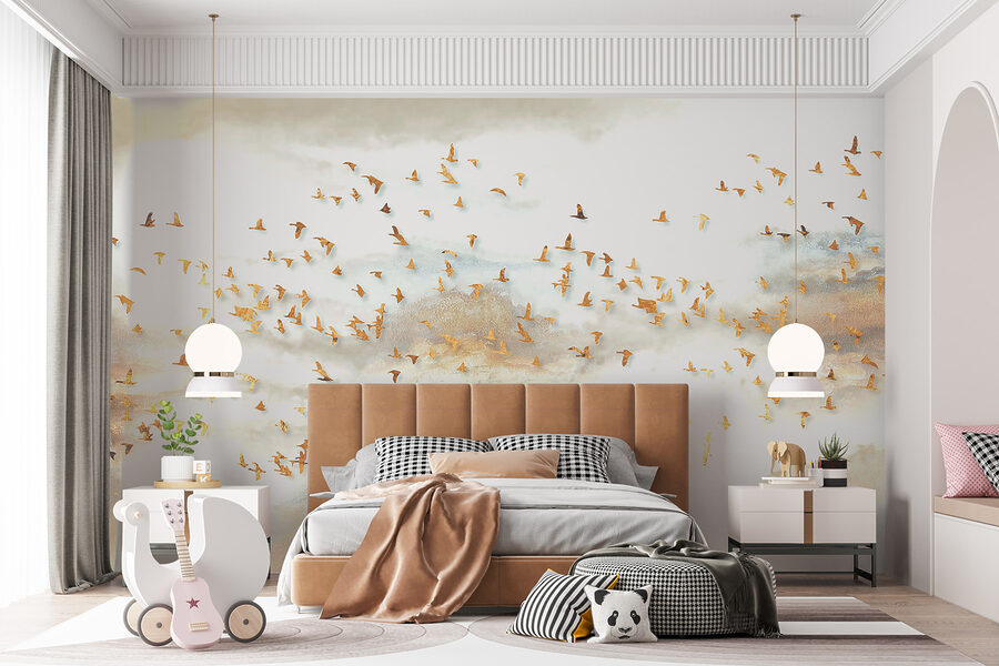 Verander elke kamer in een serene ontsnapping met deze prachtige muurschildering van een groep vogels die door een dromerige lucht vliegen. De zachte kleuren en sierlijke vogels creëren een sfeer die kalm en opbeurend aanvoelt, zoals een frisse bries op een lentedag. Stel je voor dat je aan je ochtendkoffie nipt of tot rust komt na een lange dag terwijl je naar dit fascinerende tafereel staart. Het trekt je naar binnen en wekt dagdromen en verhalen op. Bovendien voegt het een chique tintje toe aan elke ruimte, of het nu een gezellige woonkamer of een rustige slaapkamer is. Wie wil niet het gevoel hebben dat hij door de wolken zweeft?