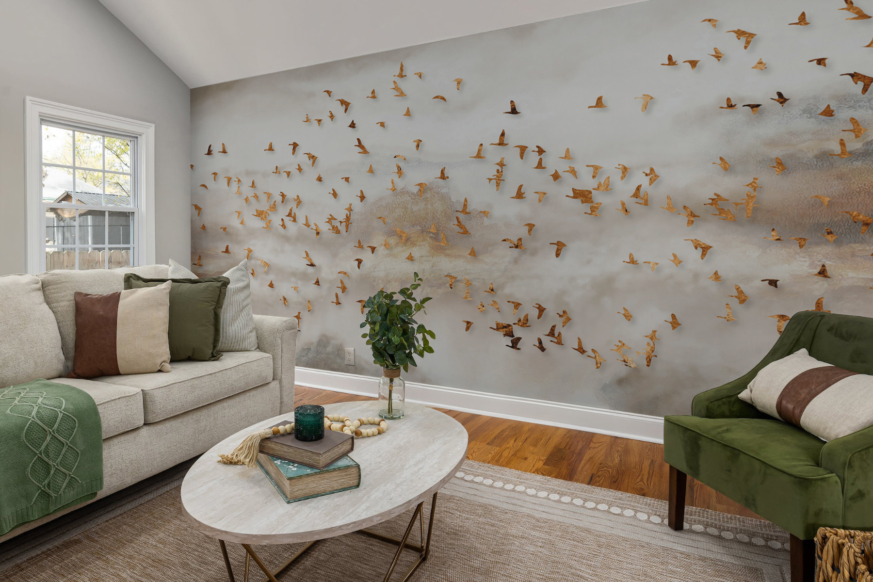Verander elke kamer in een serene ontsnapping met deze prachtige muurschildering van een groep vogels die door een dromerige lucht vliegen. De zachte kleuren en sierlijke vogels creëren een sfeer die kalm en opbeurend aanvoelt, zoals een frisse bries op een lentedag. Stel je voor dat je aan je ochtendkoffie nipt of tot rust komt na een lange dag terwijl je naar dit fascinerende tafereel staart. Het trekt je naar binnen en wekt dagdromen en verhalen op. Bovendien voegt het een chique tintje toe aan elke ruimte, of het nu een gezellige woonkamer of een rustige slaapkamer is. Wie wil niet het gevoel hebben dat hij door de wolken zweeft?