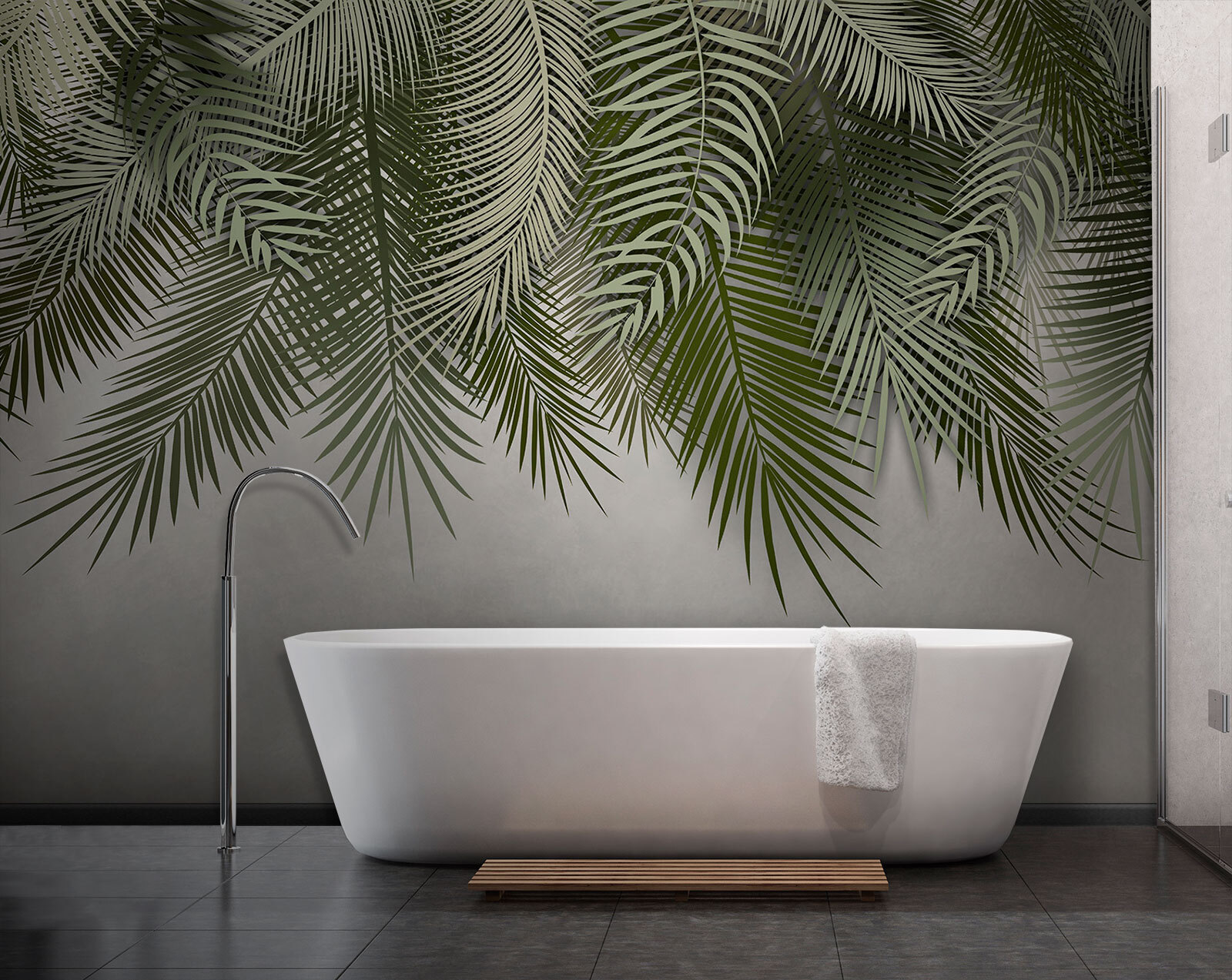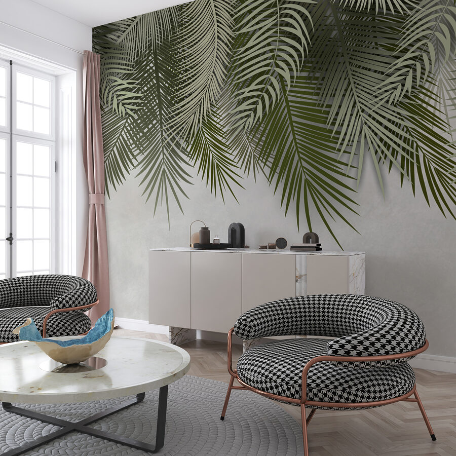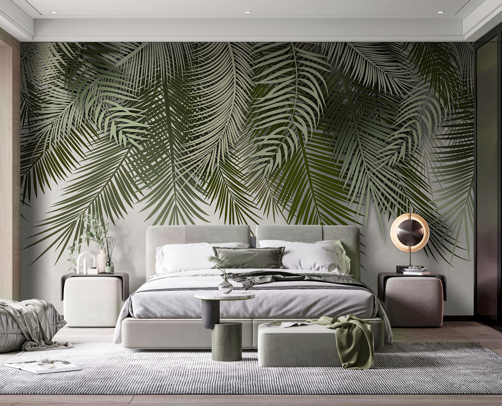 De muurschildering voelt levendig maar niet overweldigend. Het is net genoeg om je te laten denken aan warme, winderige dagen zonder dat je je zorgen hoeft te maken over planten water geven. Past goed bij minimalistische ontwerpen of je kunt het opleuken met een levendig, tropisch decor – super veelzijdig! Dit ontwerp ademt leven en frisheid en geeft je het gevoel dat je onder een afdak ligt en naar de hemel tuurt. Hoe cool is dat?