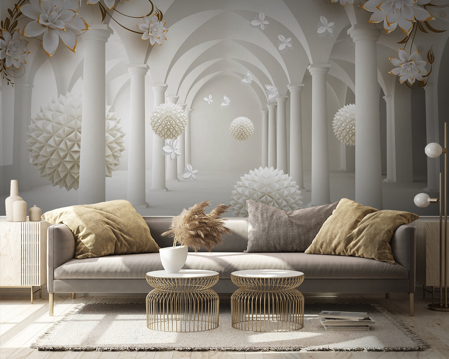 Stel je voor dat je een kamer binnenstapt die je direct meeneemt naar een elegante, dromerige hal vol zwevende bloemenbollen – klinkt magisch, toch? Deze betoverende muurschildering “Elegante hal met zwevende bloemenbollen” is niet zomaar een kunstwerk, het is een ervaring. De delicate 3D bloemenelementen en tunnelachtige bogen geven je ruimte een vleugje verfijning met een speels tintje. Perfect voor wie graag het gevoel heeft dat zijn woonkamer een portaal is naar een serene tuin of een betoverend paleis. Bovendien passen de zachte, neutrale tinten moeiteloos in elke interieurstijl, waardoor het een veelzijdige keuze is om saaie muren om te toveren in een visueel verbluffend middelpunt. Of je nu op zoek bent naar een vleugje fantasie in je dagelijkse leven of gewoon een unieke gespreksstarter wilt, deze muurschildering past perfect – waarom zou je je ruimte niet die wow-factor geven?