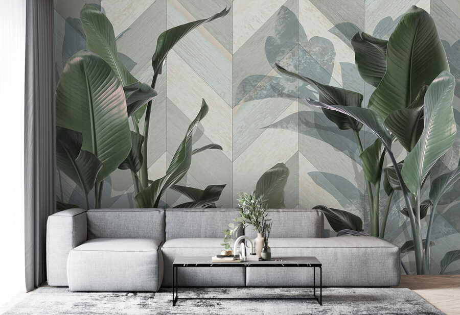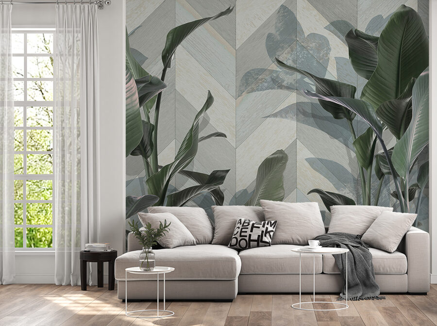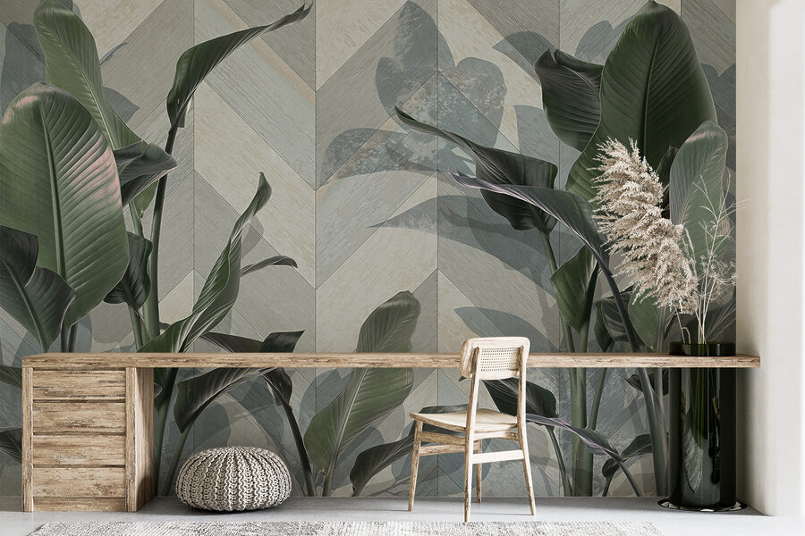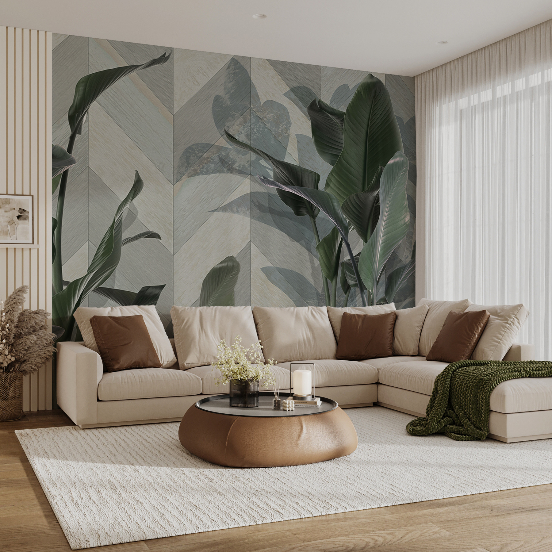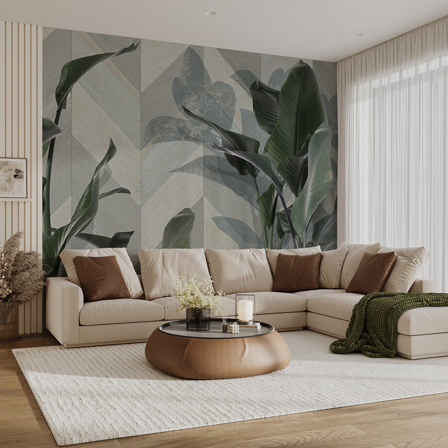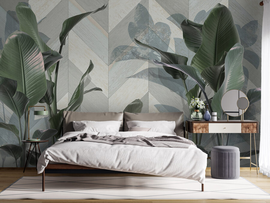 Transformeer elke kamer met deze prachtige muurschildering van weelderige groene bladeren tegen een chique achtergrond met patroon. Het is alsof je de rust van een bos in je woonruimte brengt! Stel je voor dat je elke ochtend wakker wordt en het gevoel hebt dat je in een knusse hut midden in de natuur zit. De bladeren geven een verfrissende sfeer, perfect voor de dagen waarop je verlangt naar een beetje buitenleven zonder last te hebben van insecten of het weer. Bovendien houden de subtiele patronen het interessant – niemand zal weten of je alleen maar dagdroomt over een tropisch uitje of het ook echt beleeft! Deze muurschildering is niet alleen decor; het is een ervaring die staat te gebeuren.