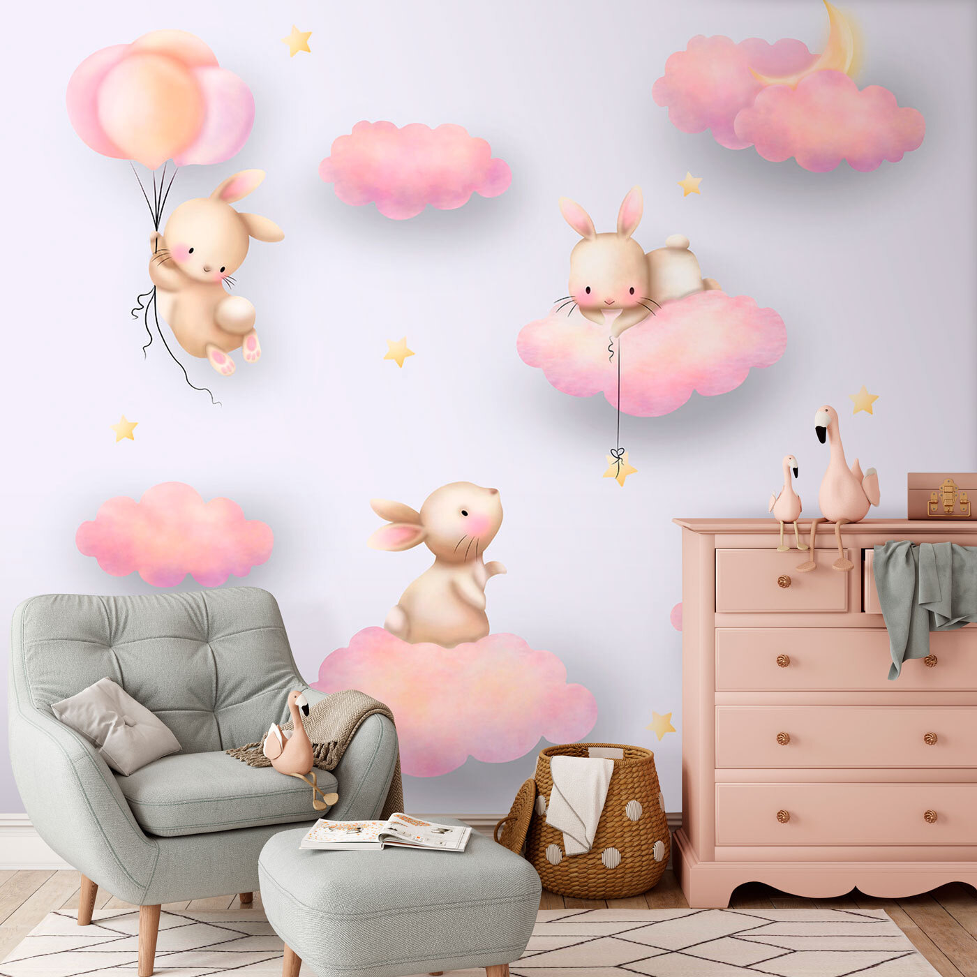 Stel je voor dat de kamer van je kind verandert in een grillig droomlandschap met deze schattige muurschildering van cartoonkonijntjes! Deze lieve konijntjes zweven op wolken, houden touwtjes vast en reiken naar de sterren – het is net een scène uit een verhaaltje voor het slapengaan! Perfect voor kinderkamers – of het nu voor je zoon of dochter is, of gewoon om een vleugje magie toe te voegen aan een kinderkamer.
