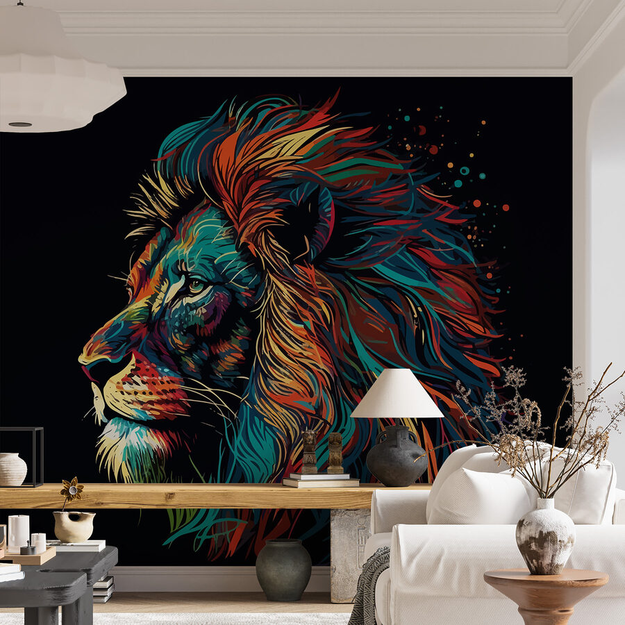 Maak kennis met een verbluffende muurschildering die in elke ruimte tot leven zal komen – zeg hallo tegen de kleurrijke leeuw met lange manen! Stel je voor dat je een kamer binnenloopt waar deze levendige, in het oog springende leeuw je begroet, met zijn manen in een kleurenpalet dat je doet denken aan een zonsondergang die smelt in de horizon. Het is alsof je een stukje wilde natuur aan je muur hebt hangen!