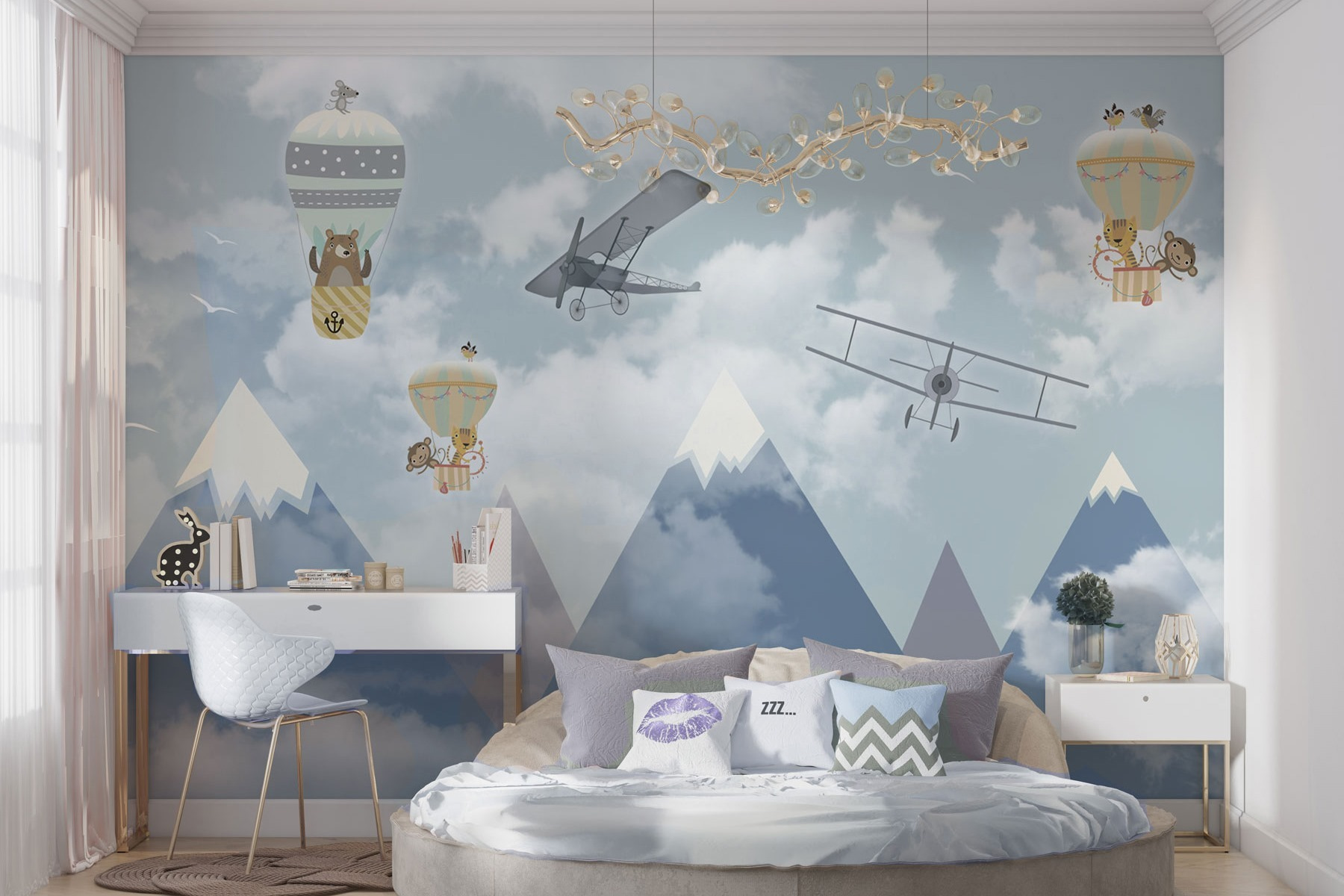 Deze prachtige muurschildering met een grillige groep heteluchtballonnen en speelse vliegtuigjes die door een dromerige lucht zweven, creëert een charmante sfeer in elke ruimte. Stel je voor dat de kleintjes naar hun nieuwe muur staren en hun verbeelding de vrije loop laten naast vriendelijke beren en nieuwsgierige beestjes. Het is alsof je een beetje avontuur in huis haalt! De zachte blauwtinten en zachte witte tinten zorgen voor een rustgevende touch, perfect voor kinderkamers of speelruimtes. Wie zou er niet van willen dromen om elke nacht de hemel te verkennen? Het is maar een muurschildering, maar het is ook een poort naar eindeloze avonturen.