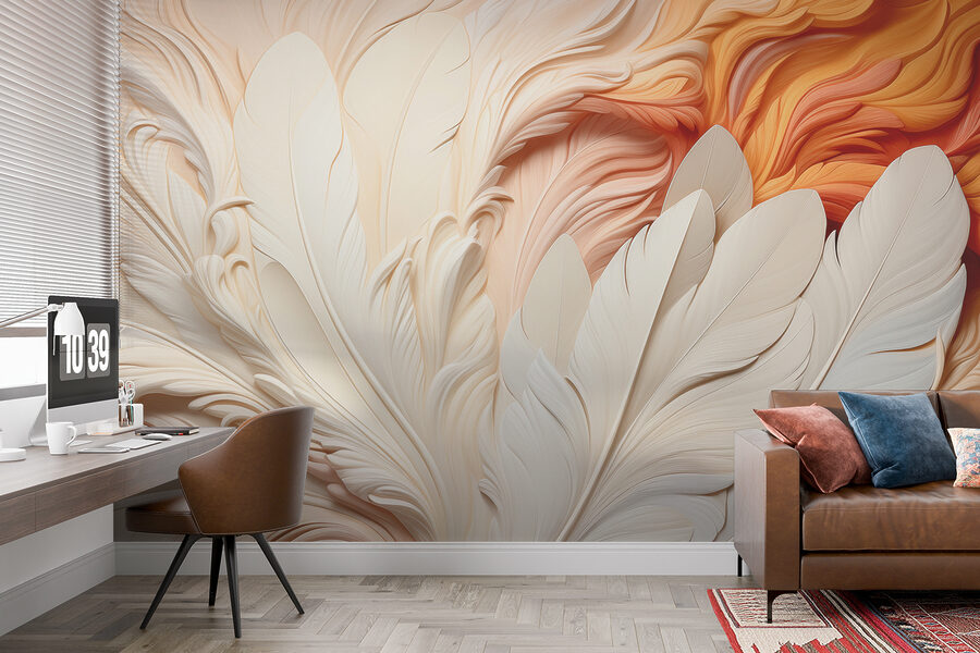 Maak kennis met “Fotobehang w01301” – een prachtig stuk dat helemaal in het teken staat van elegante, vederachtige sferen! Stel je voor dat je een kamer binnenloopt met deze zachte, wervelende veren aan de muur. Het is niet zomaar een muurschildering; het is een hele sfeer. De crèmewitte tinten die zich vermengen met de warme sinaasappels… het is net een gezellige zonsondergang die zich om je kamer sluit. Perfect om een vleugje 3D-magie toe te voegen aan elke kamer.