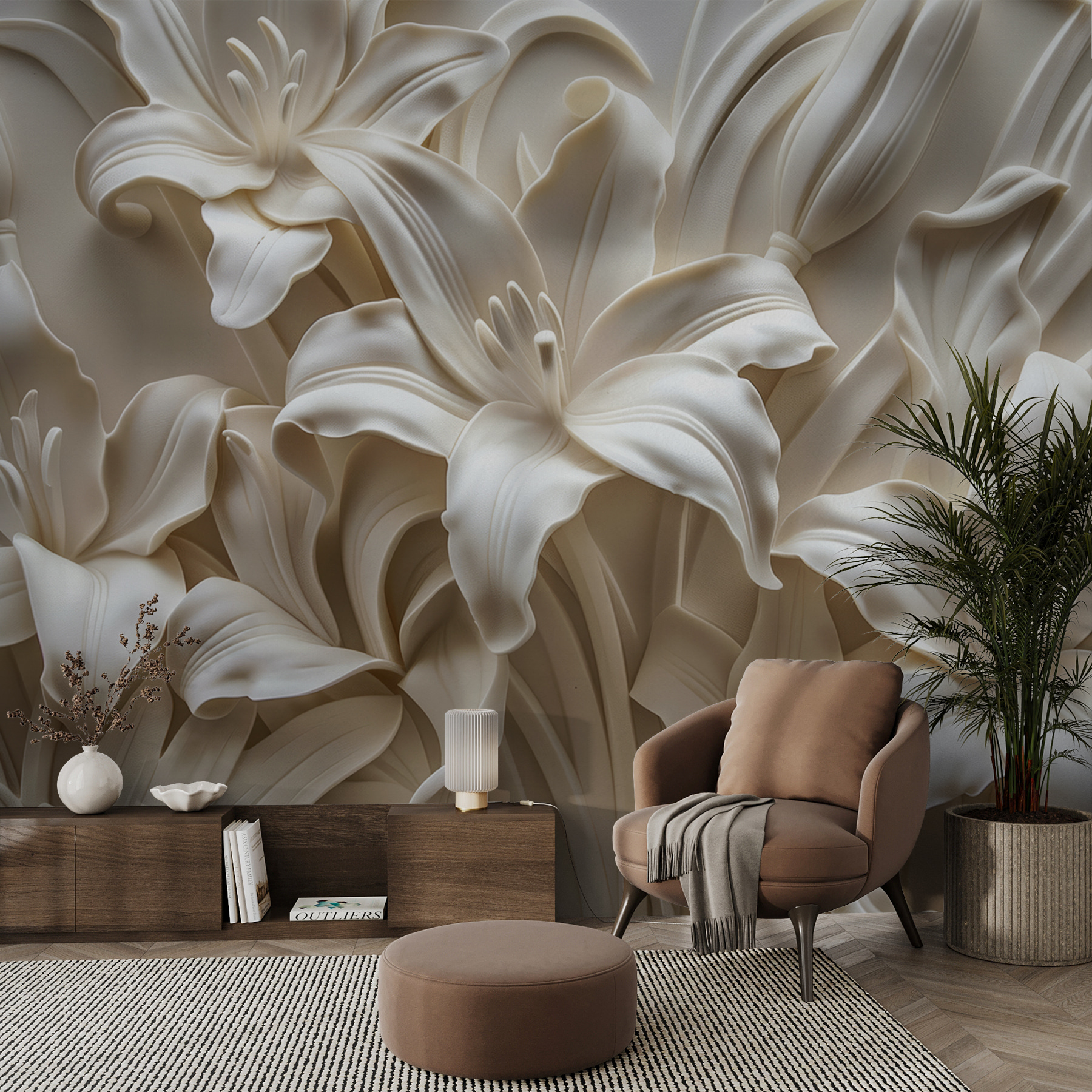 Stel je voor dat je een kamer binnenloopt en begroet wordt door een uitbarsting van elegante, crèmekleurige lelies die eruit zien alsof ze zachtjes uit de muur komen – over een wow-factor gesproken! “Fotobehang w01433” brengt een vleugje chique verfijning met zijn 3D bloemmotief. Dit is niet zomaar een muurprint; het voegt textuur, diepte en een serene sfeer toe aan elke ruimte. Perfect voor iemand die genoeg heeft van vlakke, saaie muren en net dat beetje extra flair wil.