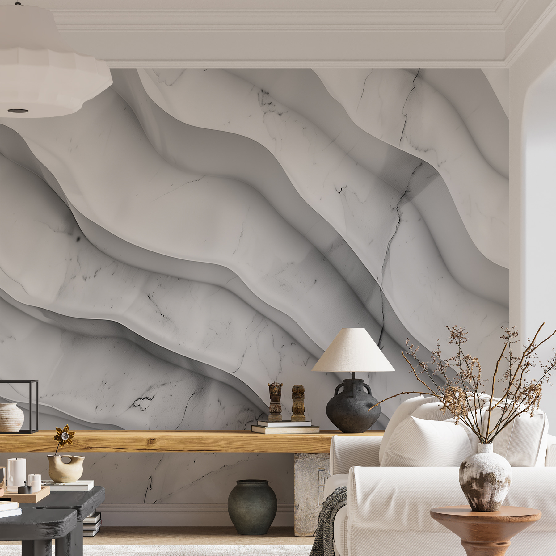 Stel je voor dat je een kamer binnenloopt en begroet wordt door de rustgevende stroom van een wit marmeren oppervlak met golvende lijnen. Het is net een dagje spa voor je muren! Deze muurschildering heeft die chique, verfijnde uitstraling, maar met een twist – die golvende lijnen voegen precies de juiste hoeveelheid speelse energie toe. Perfect voor een gezellig hoekje of een strakke kantoorruimte. Stel je voor dat je aan de koffie zit, je chique voelt en toch verrassend ontspannen. Het is jouw ruimte, opgewaardeerd met een beetje marmeren magie, waardoor gewone dagen buitengewone dagen worden. Wie wist dat een muur zoveel kon doen?