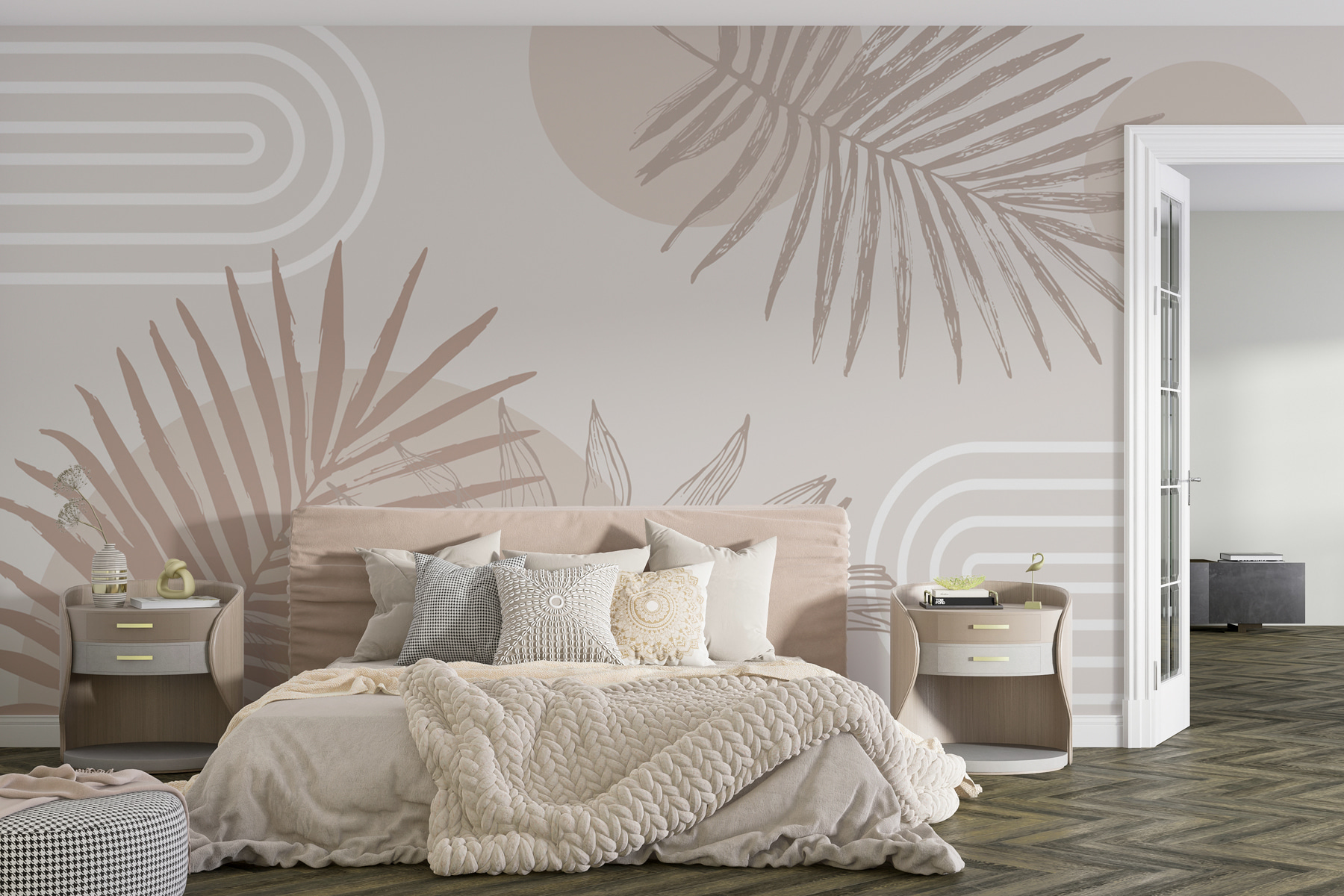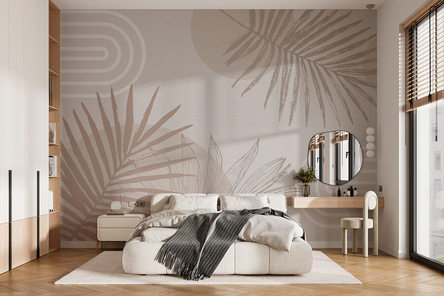 Bekijk deze fantastische muurschildering – het zijn allemaal neutrale tinten met funky geometrische vormen en palmbladeren. Stel je voor: een luie zondagochtend, koffie in de hand, genietend van de rustige sfeer die deze muurschildering met zich meebrengt. Het is net een mini-vakantie aan je muur. Perfect voor wie hunkert naar de tropen zonder jetlag. Of je nu je woonkamer opknapt of een kantoor aan huis inricht, dit ontwerp voegt een vleugje stijl toe terwijl het fluistert, “Relax, je bent thuis”. Je muren zullen er dol op zijn!
