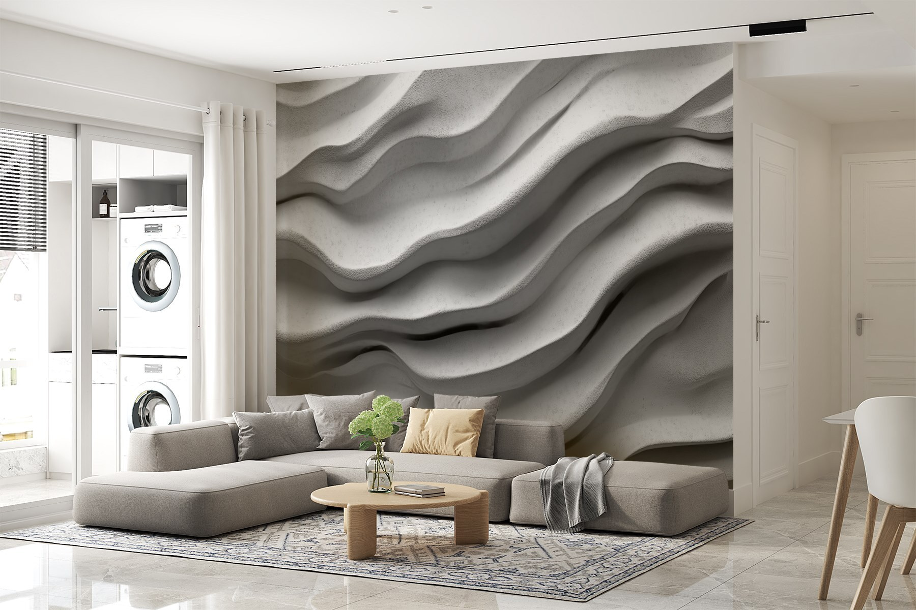Transformeer je ruimte met deze prachtige muurschildering, met een betoverend wit oppervlak versierd met vloeiende, golvende lijnen. Het is alsof je een zacht briesje binnenhaalt en een serene sfeer creëert die perfect is voor ontspanning of inspiratie. Stel je voor: een gezellige leeshoek, waar de zachte rondingen van de muurschildering je het gevoel geven dat je op een wolk zweeft. Het is subtiel en toch dramatisch – perfect voor wie de kunst van de eenvoud waardeert. Bovendien is het veelzijdig genoeg om in een moderne of klassieke omgeving te passen. Iedereen die binnenkomt zal zich afvragen hoe je zo’n stijlvolle sfeer hebt weten te creëren. Laat de golven over je muren spoelen!