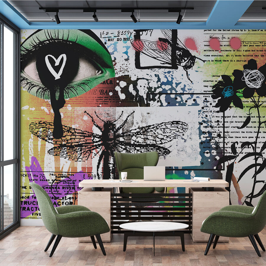 Transformeer je kamer met deze opvallende muurschildering met een levendige collage van libellen en bloemen. Stel je voor dat je een kamer binnenloopt en je meteen opgebeurd voelt door de speelse uitbarsting van kleuren en grillige ontwerpen. Het is alsof de kleine geheimen van de natuur tot leven komen op je muur en je elke keer weer blij maken als je er even naar kijkt. Deze muurschildering is niet alleen maar decor; het is een conversatiestarter, een centraal punt dat mensen aantrekt. Of het nu een gezellig leeshoekje is of een levendige woonkamer, deze muurschildering brengt leven en creativiteit in elke ruimte. En wie houdt er nu niet van een libel die een oogje in het zeil houdt?
