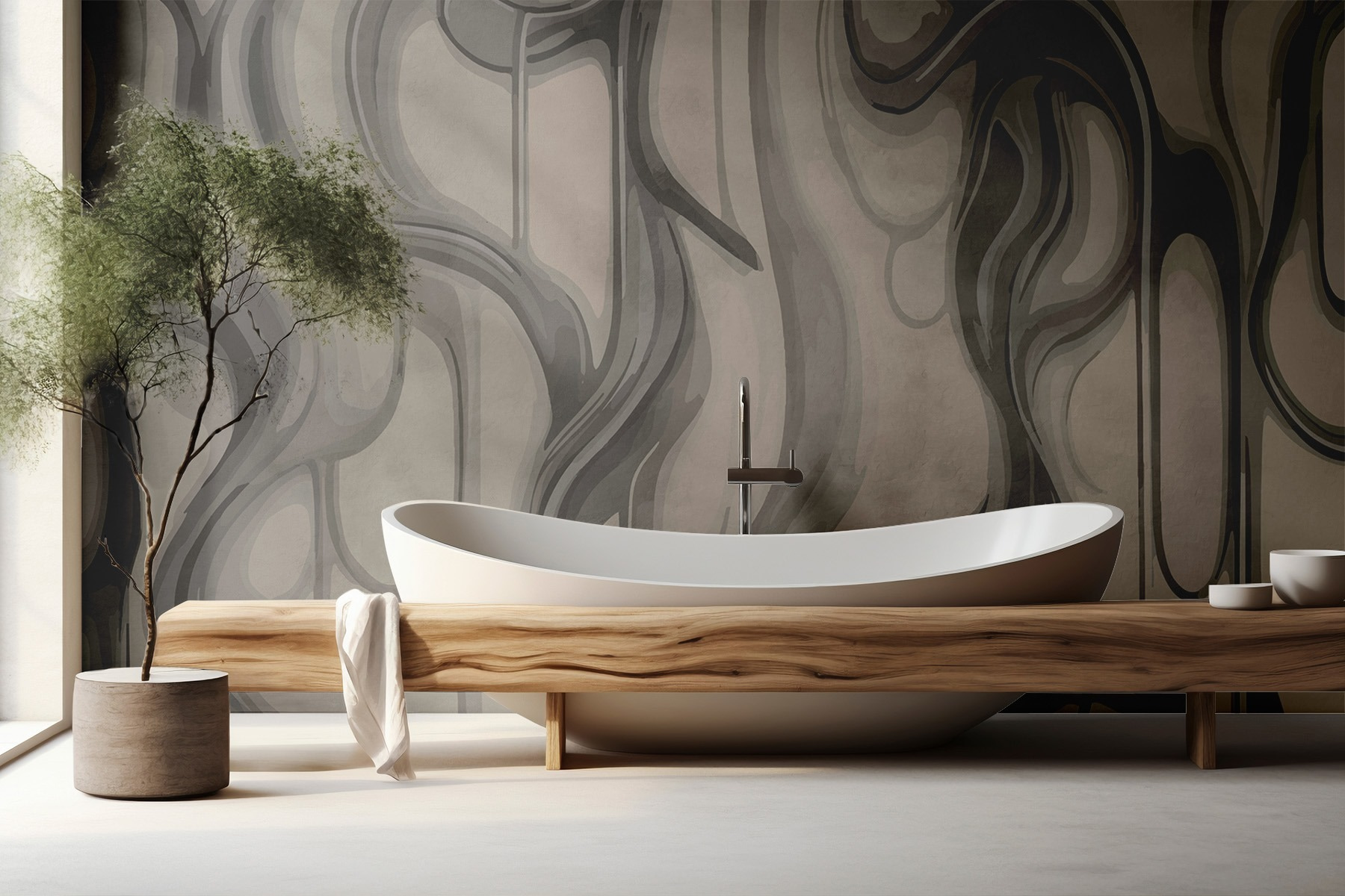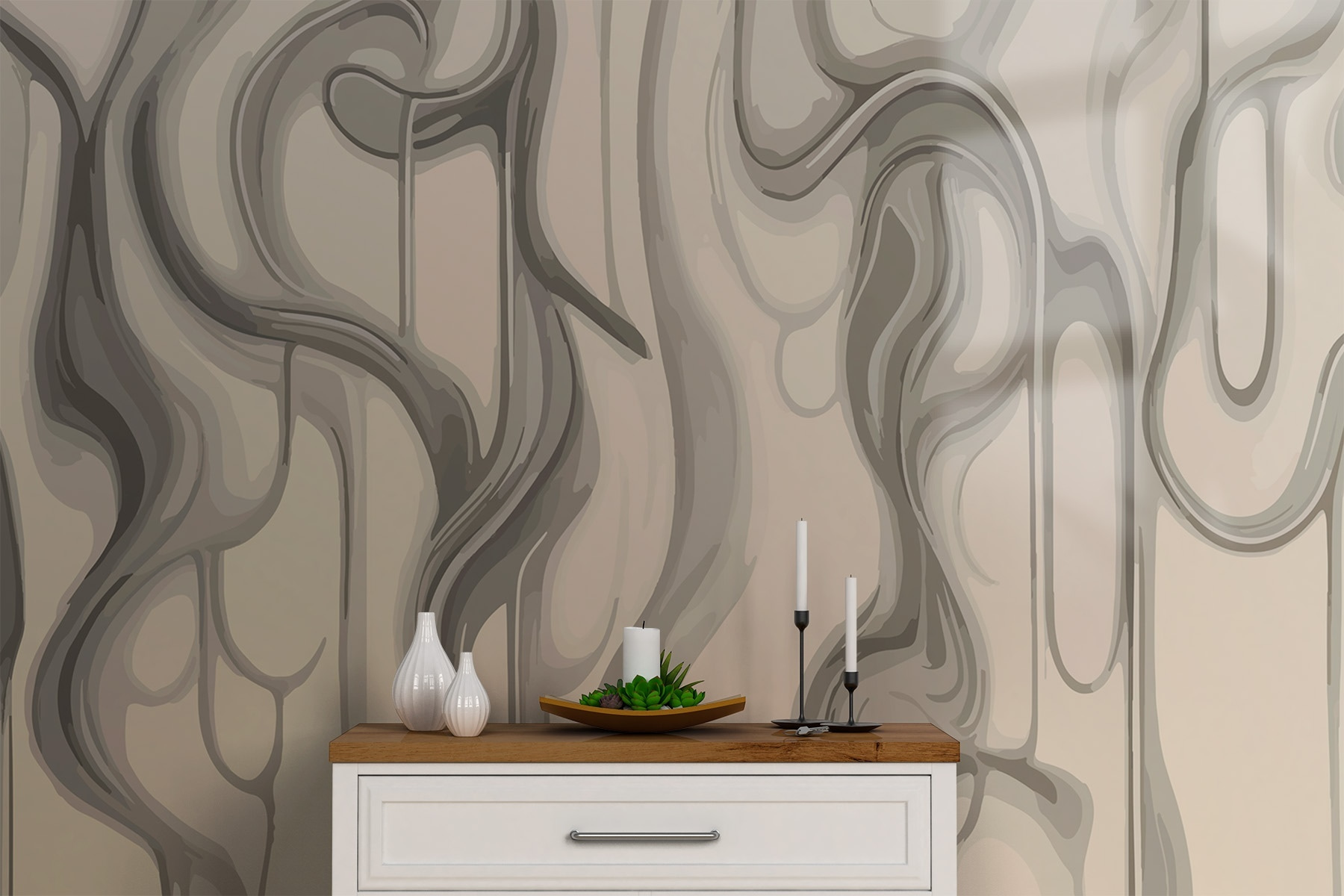 Transformeer elke ruimte met deze prachtige muurschildering met abstracte vormen in zachte, neutrale tinten. Het is als een zacht gefluister op je muur, dat een serene achtergrond creëert die uitnodigt tot kalmte en creativiteit. Stel je voor dat je ‘s ochtends aan je koffie zit te nippen, terwijl de zachte rondingen van het ontwerp je omringen en elke blik een beetje interessanter maken. Het heeft een moderne uitstraling, perfect voor gezellige hoekjes of open woonkamers. Een gespreksstarter? Absoluut! Deze muurschildering is niet alleen mooi, maar prikkelt ook de verbeelding. Wie wist dat muren zo expressief konden zijn?