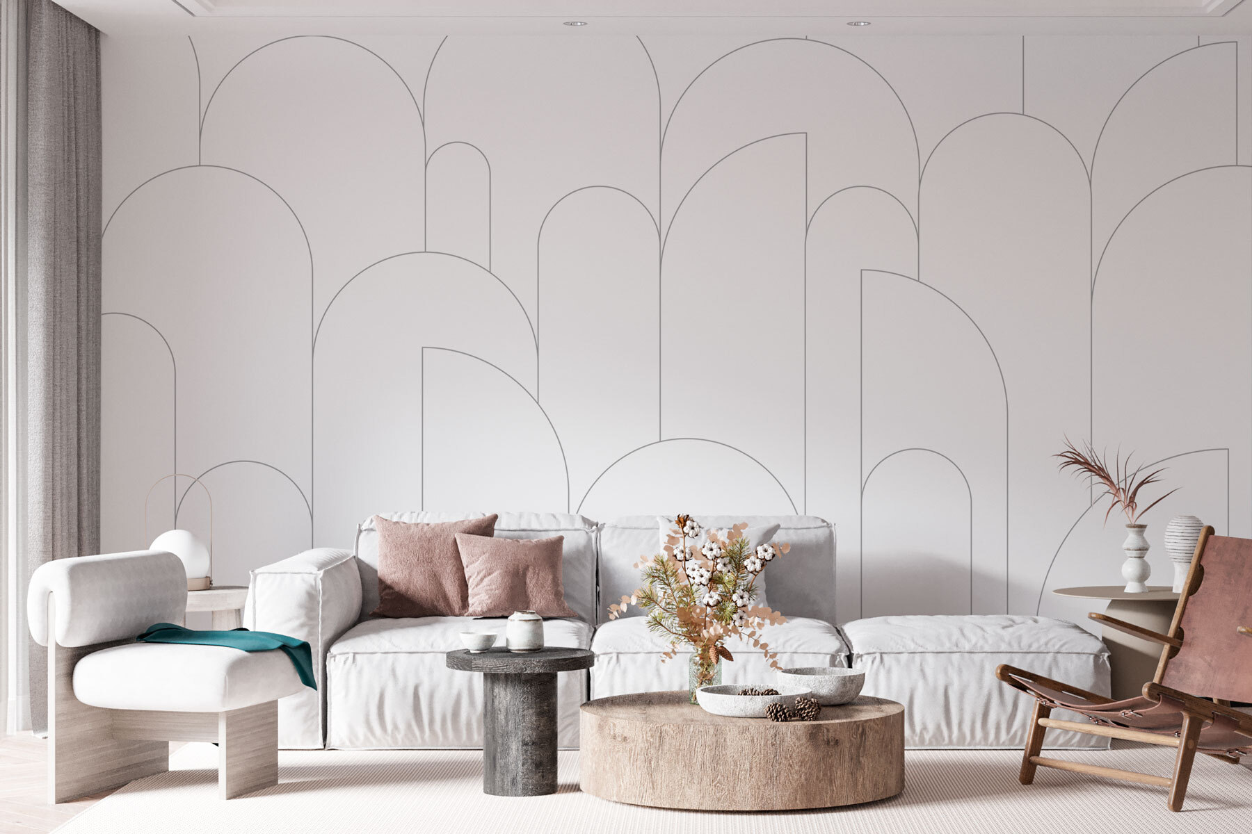De speelse vormen dansen over de muur en wekken nieuwsgierigheid en gesprekken op, terwijl het minimalistische kleurenschema zorgt voor een rustige basis. Of het nu gaat om een woonkamer of een thuiskantoor, deze muurschildering vormt het decor voor creativiteit. Stel je voor dat je vrienden ontvangt, met een drankje in de hand, met deze schoonheid als achtergrond. Een muurschildering die niet alleen decoratief is, maar ook uitnodigt tot verhalen en gelach – wat wil je nog meer?