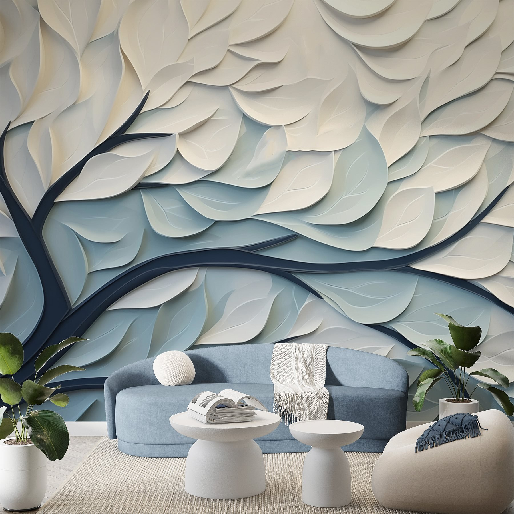 Verander elke ruimte in een rustgevende oase met deze prachtige muurschildering van witte en blauwe bladeren. Stel je eens voor dat je een kamer binnenloopt waar de takken over de muur reiken en een vleugje natuur naar binnen brengen. De zachte kleuren zijn als een zacht briesje op een warme dag en roepen rust op zonder om aandacht te schreeuwen. Perfect voor woonkamers, slaapkamers of zelfs een knus hoekje waar je ‘s ochtends aan je koffie nipt. Het is alsof je een stukje van het buitenleven binnen handbereik hebt – tuinieren is niet nodig. En wie houdt er nu niet van een mooie achtergrond voor spontane dansfeestjes?