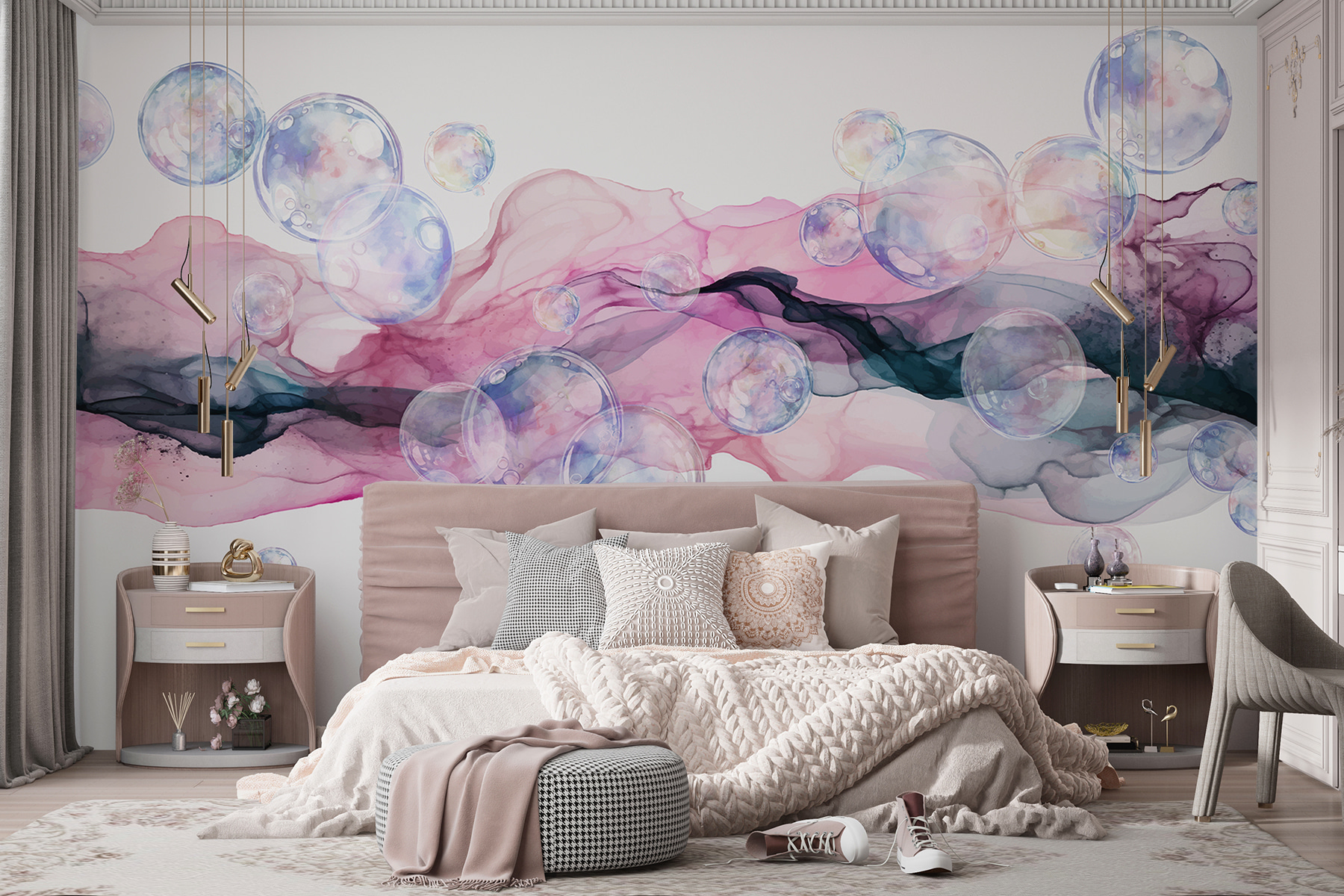 Stel je een dagdroom voor die tastbaar is gemaakt – deze muurschildering is pure magie. De bubbels zweven als zacht gefluister in een betoverende dans van roze en paars. Ooit het gevoel gehad een aquarelschilderij binnen te stappen? Dit is je kans. Je kamer kan een rustgevende oase worden of een grillig universum waar de creativiteit gewoon kan stromen. Voel de sereniteit over je heen spoelen als het licht deze delicate tinten raakt en zachte reflecties werpt. Perfect voor iedereen die gelooft in de schoonheid van verbeelding – en wie kan er niet wat meer eigenzinnigheid in zijn leven gebruiken?