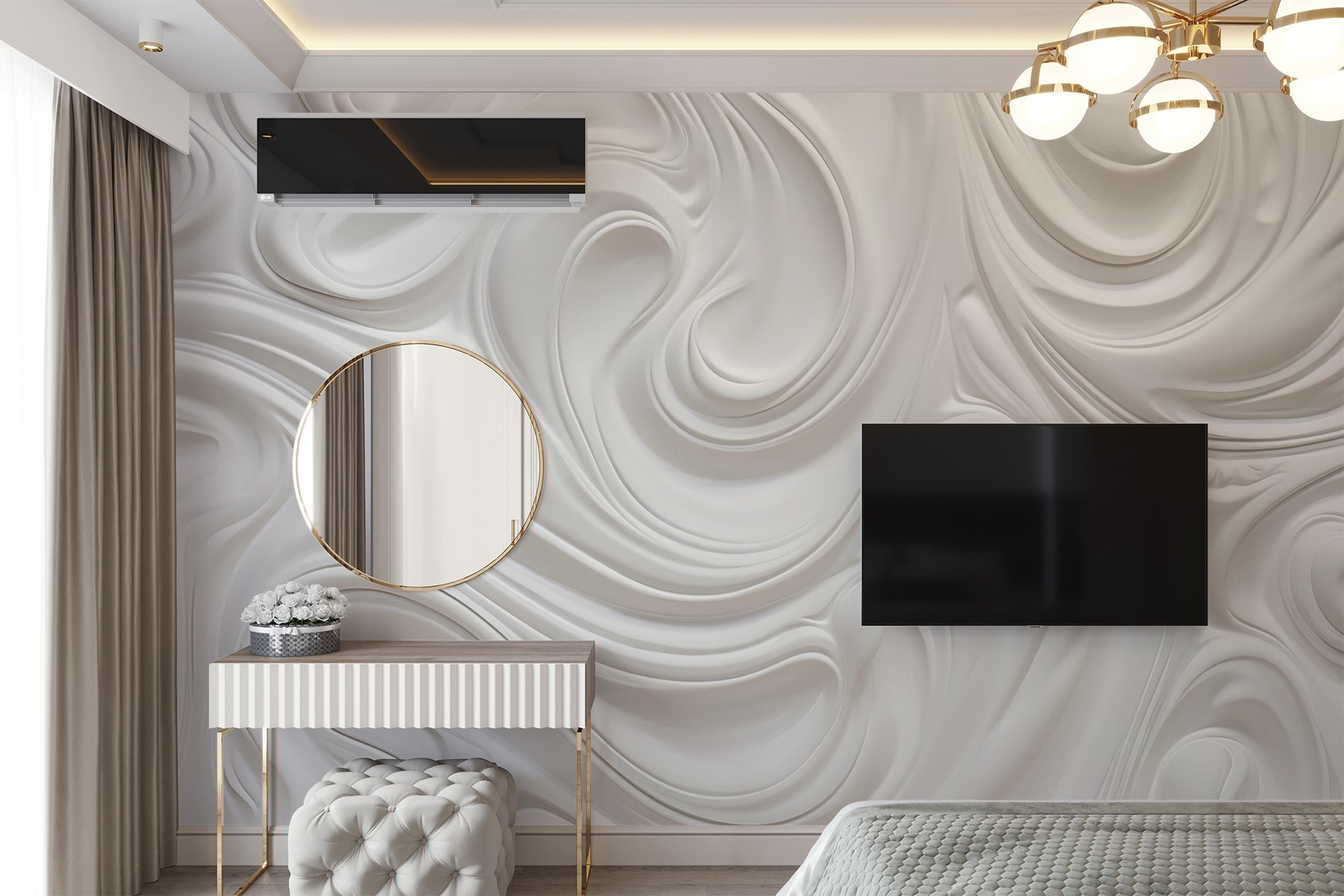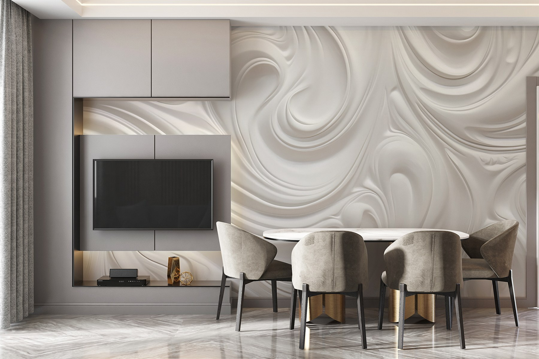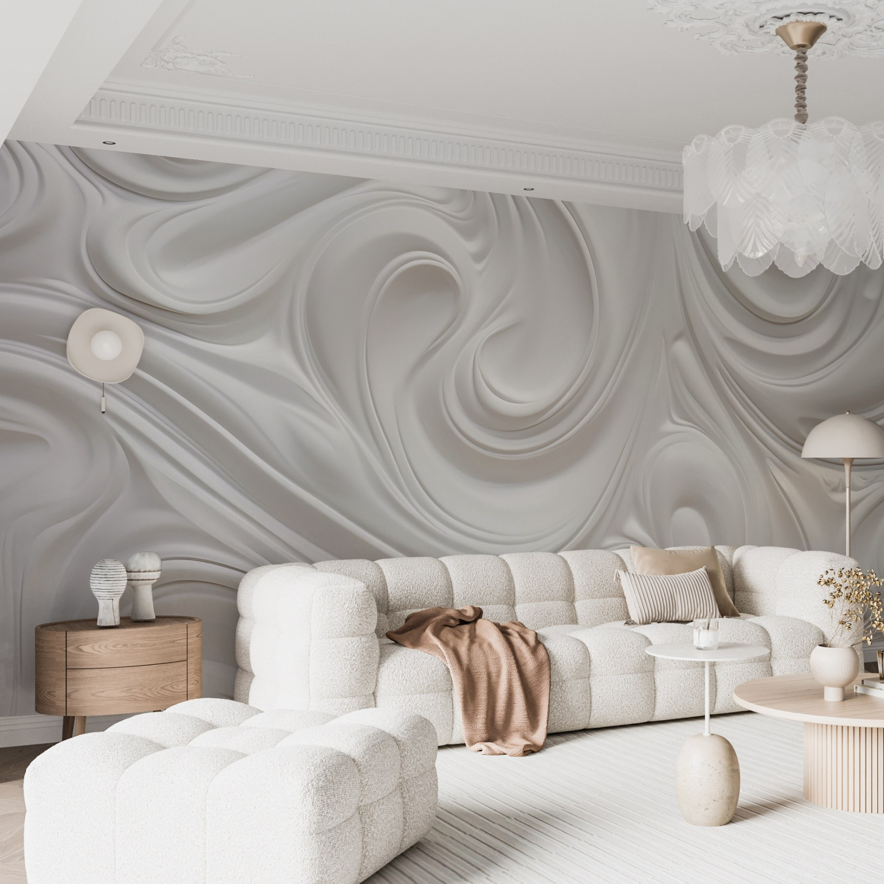 Transformeer je ruimte met deze muurschildering met een dromerige dans van witte wervelingen. Het is alsof je een zacht briesje binnenhaalt of een zachte wolk om je heen hangt. Stel je voor dat je wakker wordt met deze vredige achtergrond en je bij elke blik een beetje lichter voelt. Deze muurschildering is perfect voor elke kamer en combineert moeiteloos een moderne stijl met een vleugje eigenzinnigheid. Het is het soort muurschildering dat kan inspireren tot dagdromen of creatieve gedachten kan aanwakkeren – hallo, ideeën voor kunstprojecten! Verhoog die muren en laat de allure van vloeiende vormen je huis een unieke flair geven. Wie wist dat muren zo levendig konden zijn?