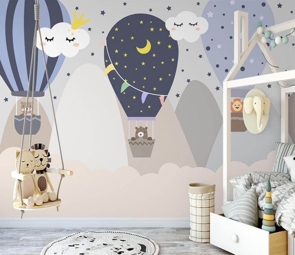 Stel je een wereld voor waarin grillige heteluchtballonnen ontspannen door de lucht zweven, met daarin een knuffelbeer en een vrolijke leeuw. Deze charmante muurschildering toont een betoverend tafereel dat een gewone muur kan veranderen in een magische ontsnapping. Met zachte pasteltinten straalt het rust en vreugde uit, waardoor het perfect is voor een kinderkamer of zelfs een gezellig leeshoekje. Stel je voor hoe de kleintjes omhoog kijken en dromen van avonturen tussen de wolken. Wie zou er niet glimlachen om een beer met een bordje vol wijze woorden? Het is als een dagelijkse herinnering om het leven wat minder serieus te nemen. Voeg wat lichtheid toe aan je ruimte en laat je muren hun eigen schattige verhalen vertellen!