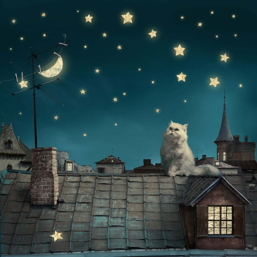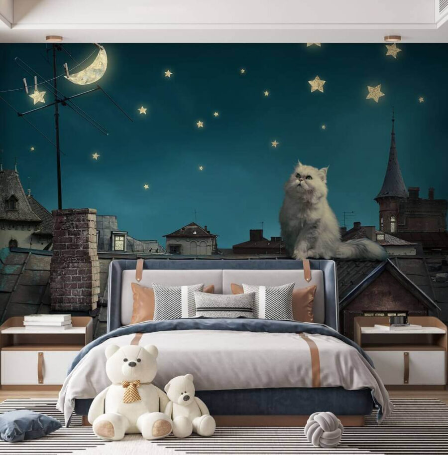 Hier is een muurschildering die je doet dromen van nachten op daken en sterrenhemels. “Kat staart naar de nachtelijke hemel” is als iets uit een grillig verhaaltje voor het slapengaan. Stel je deze scène voor in je woonkamer of kinderkamer – zo magisch! De dromerige blik van de kat naar de sterren is pure betovering, een vredige ontsnapping aan de drukte. Kinderen zullen dol zijn op de speelse sfeer en volwassenen op de rustgevende esthetiek. Het is een mix van abstracte charme en kinderlijke verwondering, perfect om de verbeelding aan te wakkeren. Plus, wie kan die schattige, pluizige kat weerstaan die nieuwsgierig de nacht in staart?