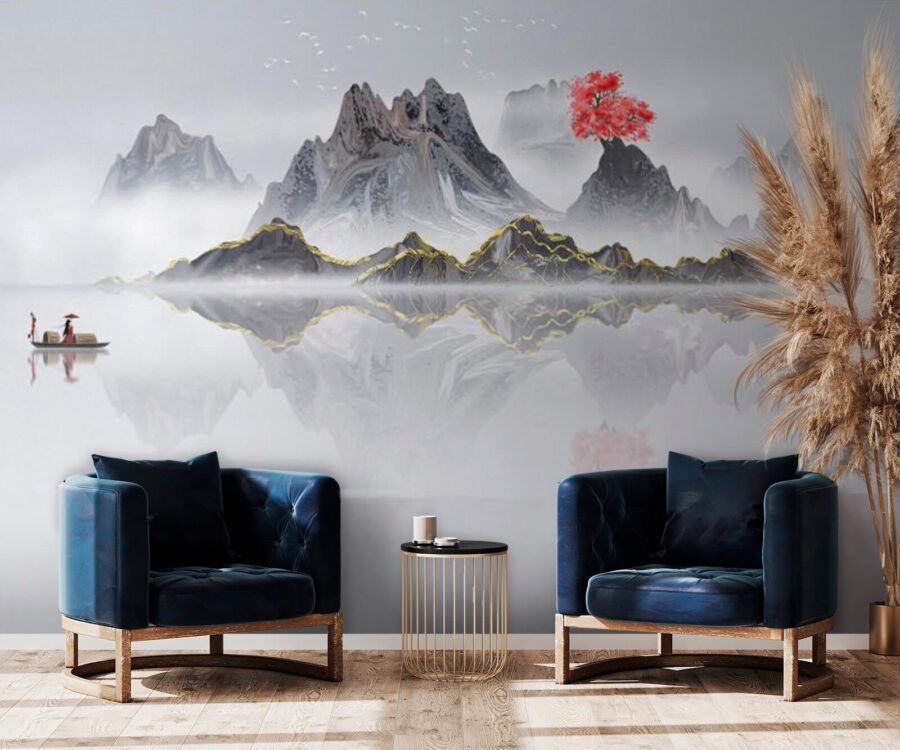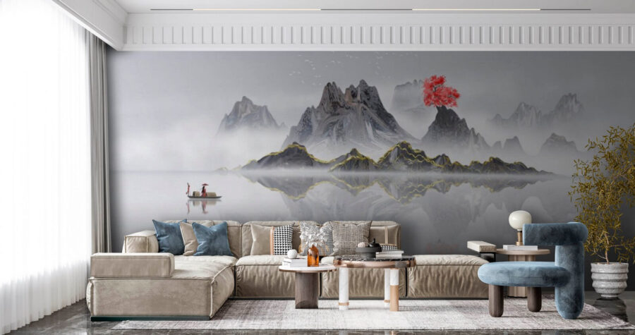 Transformeer elke kamer met deze prachtige muurschildering, met een majestueuze bergketen en een opvallende rode boom tegen een rustige waterachtergrond. Het is alsof u zich in uw eigen huis in een oase van rust bevindt. Stelt u zich eens voor dat u gezellig met een kopje thee zit en u laat meevoeren door het serene tafereel.