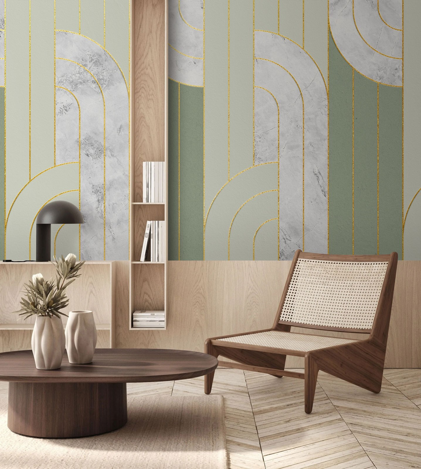 Transformeer elke ruimte met deze muurschildering met elegante patronen en rustgevende kleuren. Stel je voor dat je een kamer binnenloopt waar de zachte, vloeiende lijnen over de muren dansen en een sfeer van rust creëren. Het is als een frisse wind door je huis. Of je nu neerploft met een boek of vrienden ontvangt, deze muurschildering springt in het oog zonder te opzichtig te zijn. Zie het voor je in een gezellig hoekje of als een prachtig decor in je woonkamer. Het nodigt je uit om te ontspannen, thee te drinken en gewoon te genieten van de schoonheid om je heen – perfect om goede gesprekken op gang te brengen.