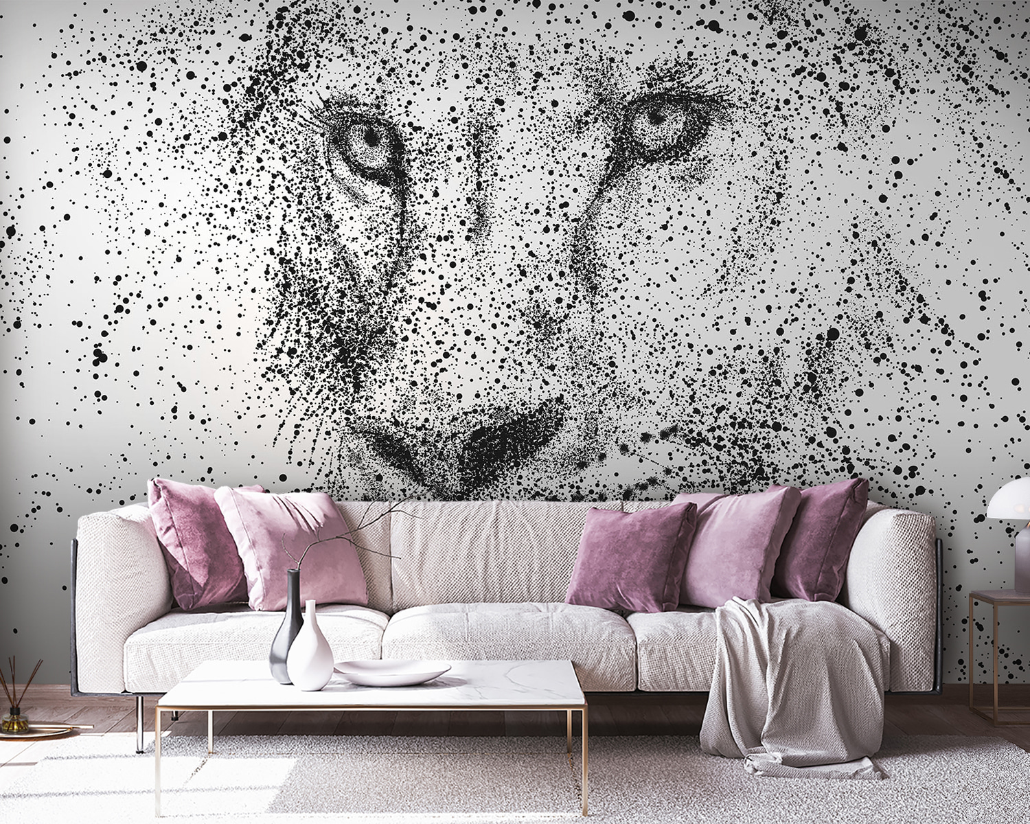 Stel je voor dat je een kamer binnenloopt en de intense blik van een leeuw voelt. Deze zwart-witte muurschildering is niet zomaar een kunstwerk, het is als een gedurfd statement en een rustige meditatie in één. Die stippen en spetters vormen het woeste maar betoverende gezicht van een leeuw, die tegelijkertijd kracht en elegantie uitstraalt. Deze muurschildering is perfect voor zowel minimalisten als dierenliefhebbers en verandert saaie muren in een boeiend middelpunt. Vrienden kunnen zich verliezen in de details en gesprekken of momenten van reflectie uitlokken. Het is alsof er een stille bewaker over je waakt, die een vleugje wilde schoonheid aan je ruimte toevoegt.