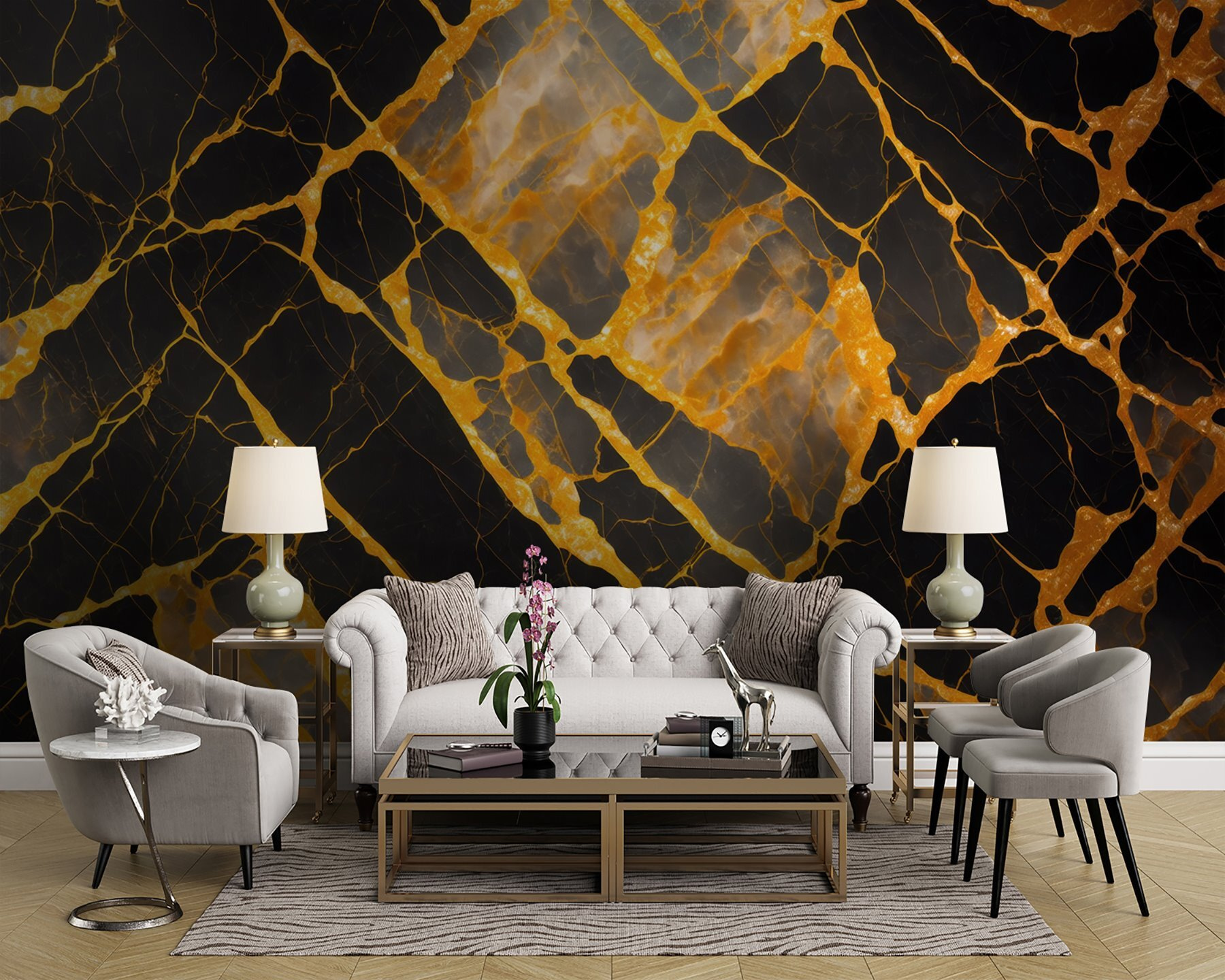 Transformeer je ruimte met deze prachtige muurschildering die een gedurfd zwart en amberkleurig patroon tot leven brengt. Stel je voor dat je een kamer binnenstapt die net zo dramatisch aanvoelt als een zonsondergang boven een woestijn, met wervelende, warme kleuren die uitnodigen tot een gesprek en creativiteit. Het is alsof je een kunstwerk aan de muur hebt hangen dat nieuwsgierigheid opwekt. Bovendien past het opvallende ontwerp gemakkelijk in verschillende inrichtingsstijlen, van modern tot eclectisch. Of het nu in een gezellig leeshoekje is of in een levendige woonkamer, deze muurschildering zou wel eens de conversatiestarter kunnen zijn waarvan je niet wist dat je hem nodig had. Dus ga je gang, laat die muren het woord doen!