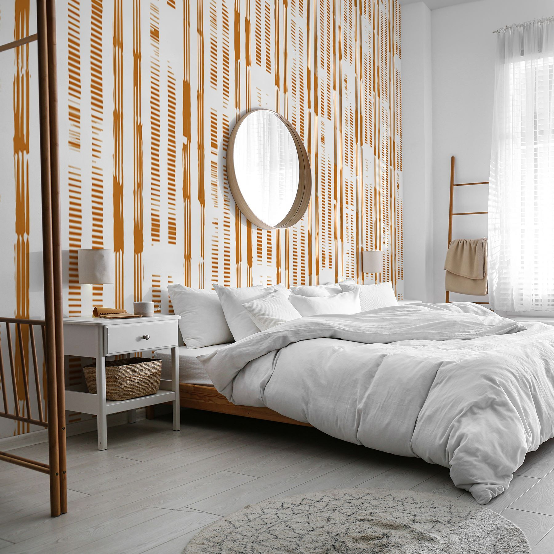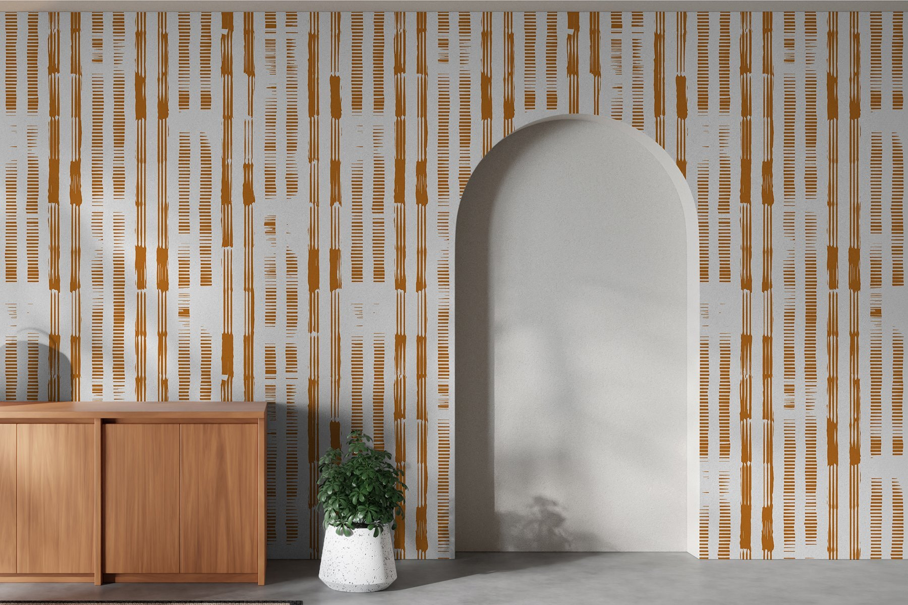 Bekijk deze opvallende muurschildering met een verticaal gestreept patroon en opzettelijke openingen – perfect om een beetje moderne flair aan je ruimte toe te voegen! Deze muurschildering houdt het midden tussen abstracte en gestreepte ontwerpen, waardoor het een opvallende keuze is voor iedereen die iets unieks maar toch veelzijdig wil. Stel je dit voor in je woonkamer of kantoor: de strakke lijnen en het georganiseerde patroon zijn speels en toch verfijnd. Bovendien zorgen de aardse oranje tinten voor een warme, gezellige sfeer die gewoon zo uitnodigend is.