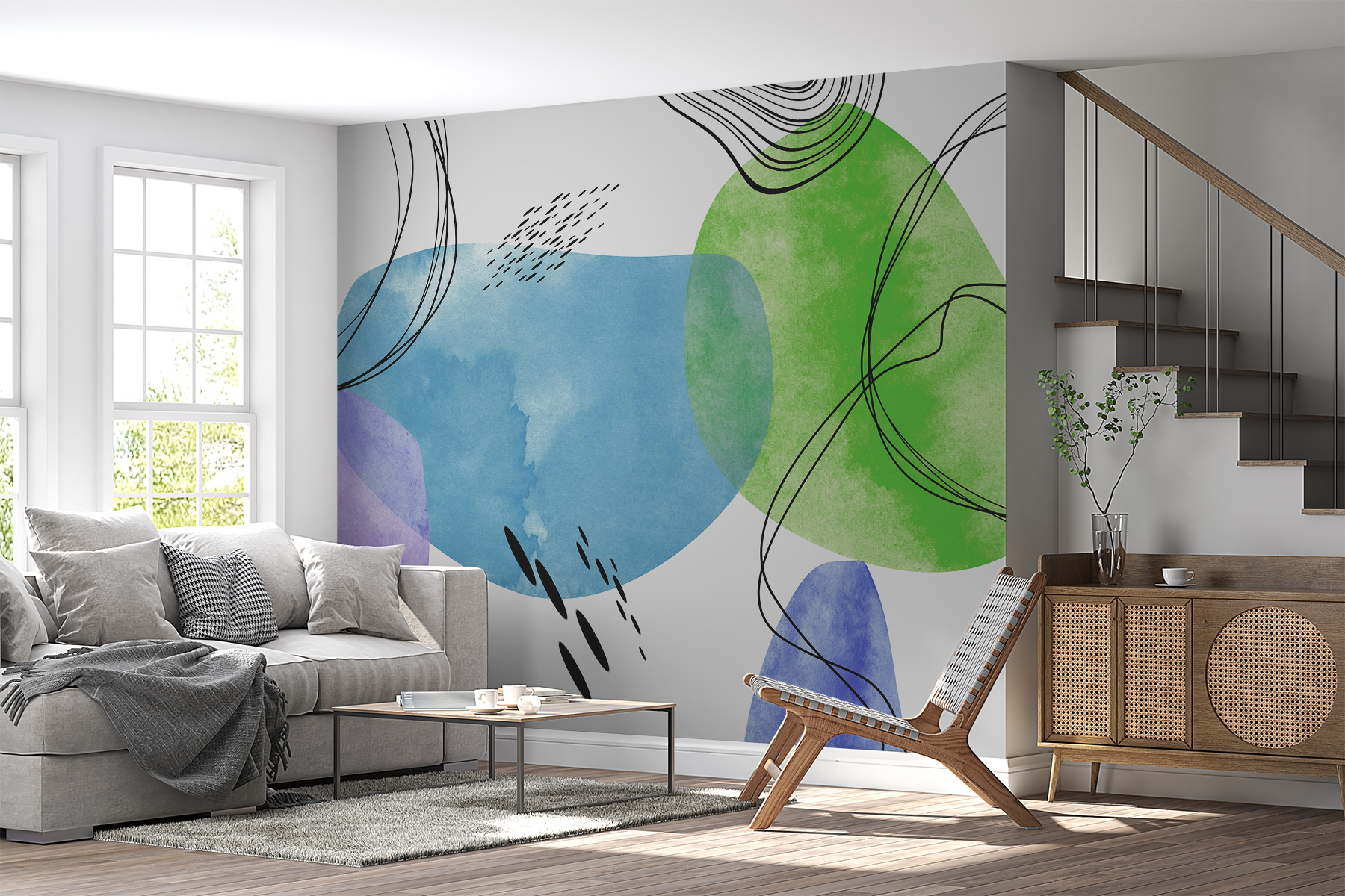 Stel je voor dat je elke dag thuiskomt met “Fotobehang Green and Blue Art”. Het is als een zachte plens kalmte en creativiteit in je leefruimte. De groene en blauwe tinten vloeien in elkaar over als een sereen meer dat gekust wordt door licht. Abstracte vormen dansen als het ware op je muur en veranderen elke lege ruimte in een modern meesterwerk.