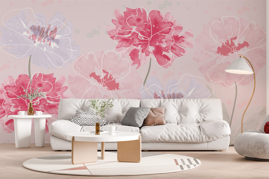 Ooit een kamer binnengelopen en het gevoel gehad dat je in een dagdroom was beland? Dat is wat deze muurschildering doet. Het is een vleugje aquarelmagie, met bloemen die geheimen uit een pastelkleurige wereld lijken te fluisteren. Perfect om een vleugje eigenzinnigheid toe te voegen waar een beetje vreugde nodig is. Stel je voor dat je thee drinkt met deze schoonheid als achtergrond – gegarandeerd dat elke roddelsessie op een tuinfeest lijkt. Het zachte roze en de bloemen zorgen voor een zachte, vrolijke sfeer. Precies goed voor mensen die houden van een beetje kunst in hun leven.